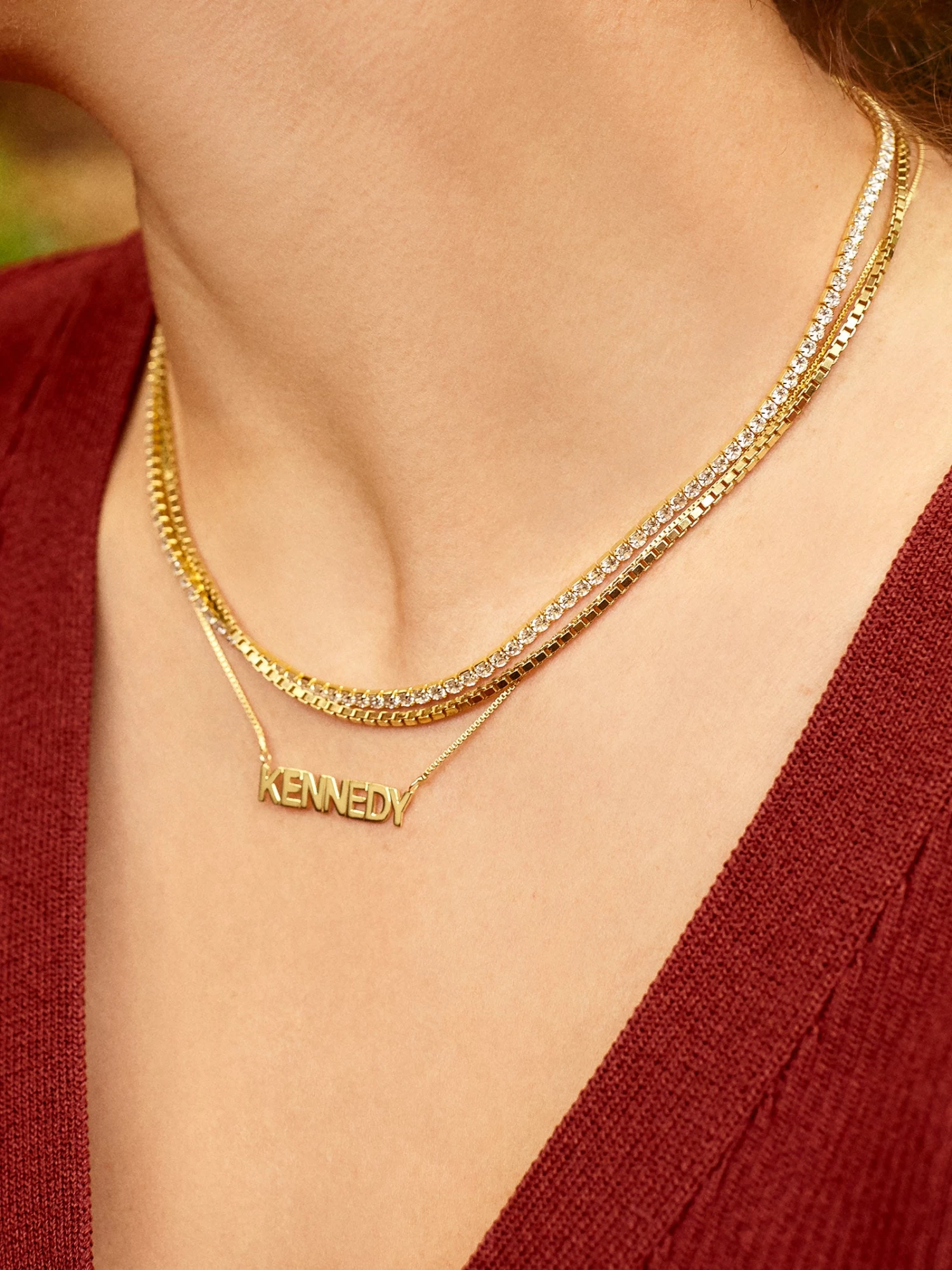 The beloved nameplate necklace gets even trendier thanks to upgraded fonts. Whether you opt for a classic name or a favorite phrase, the range of customizable options will help you put together a personal piece that is uniquely yours. Our BaubleBar Fine jewelry is finished with a thick layer of 18k real gold plating over 925 sterling silver.