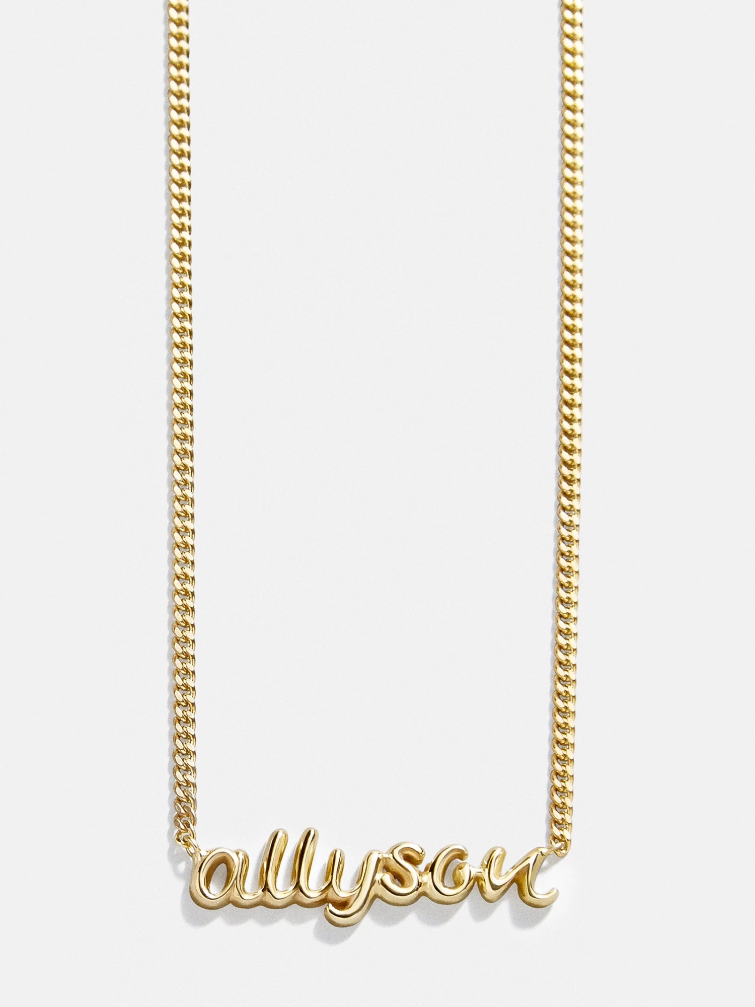 A modern take on the classic nameplate necklace is the Sterling Silver Curb Chain Custom Nameplate Necklace. This includes a lowercase script bubble font with our curb chain. Design a piece that’ll last for years to come.