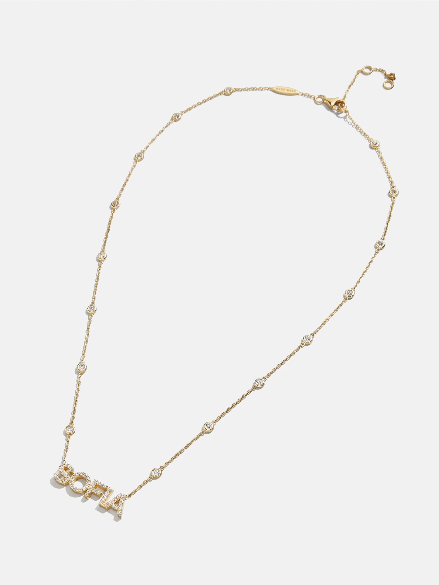 We took our beloved, best-selling Yasmine style and gave it a personalized touch with our 18K Gold Custom Yasmine Nameplate Necklace. This custom name piece features the personalization of your choosing framed by a contemporary18K gold plated sterling silver chain. Dotted with high-shine Cubic Zirconia bezel stones, this accessory is sure to become a staple in your everyday ensemble.