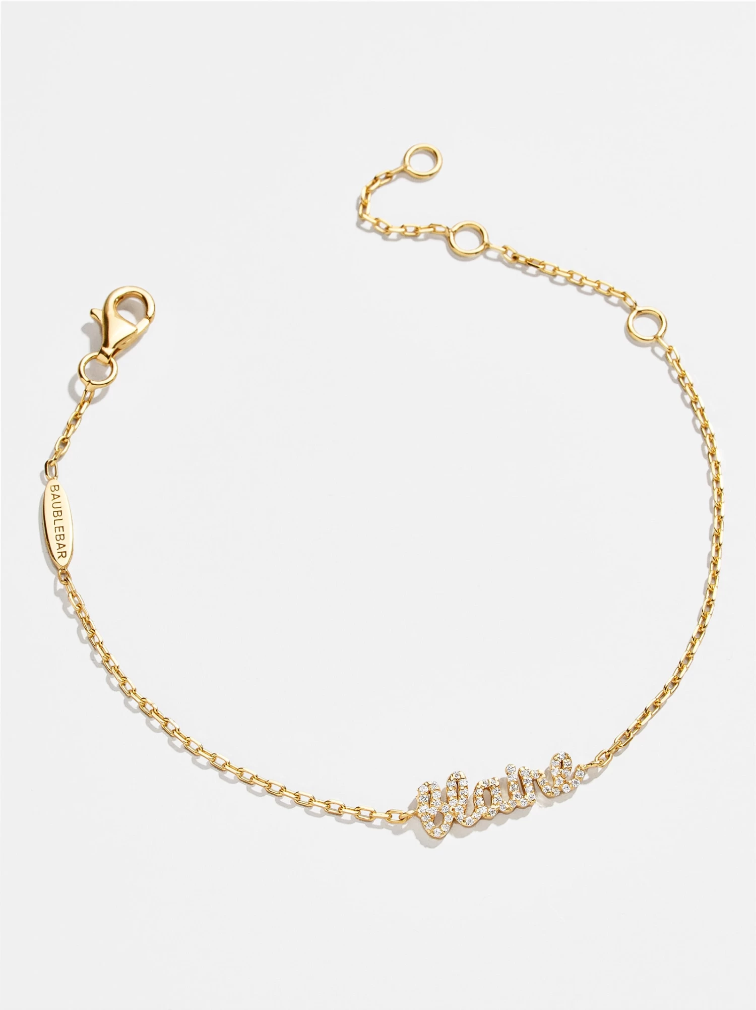 For those who like to add a little bit of sparkle to their personalized pieces, we designed the 18K Gold Pavé Custom Nameplate Bracelet. Type out any personalization you please and your customization will appear in a pretty script font. The nameplate will be placed on a super dainty paperclip chain.
