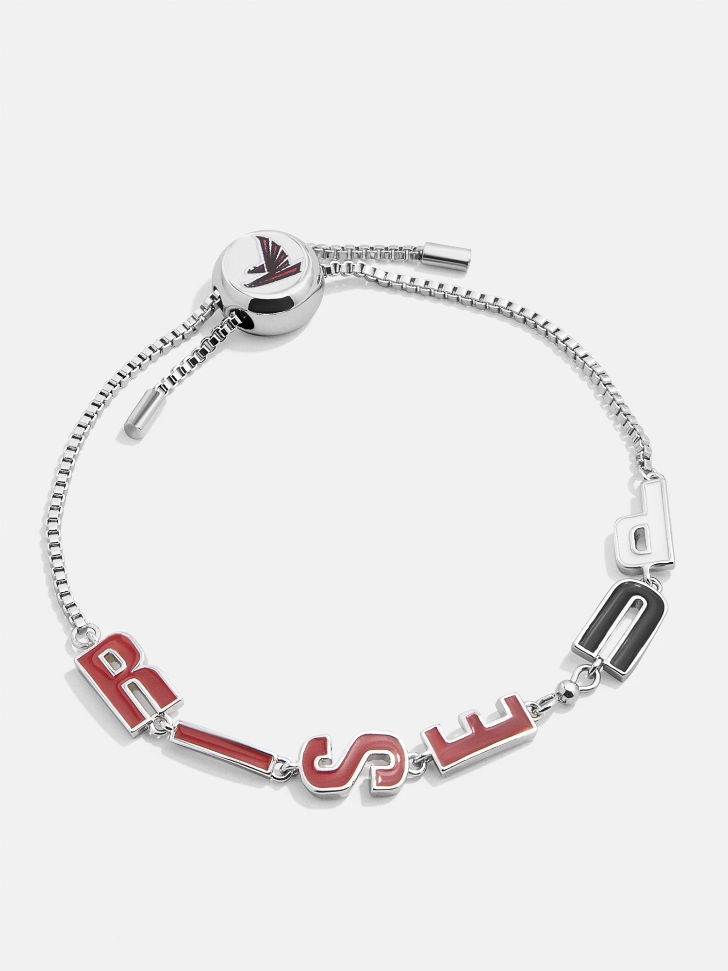 Our NFL Slogan Bracelets are fan gear like you’ve never seen before. The Atlanta Falcons Silver Slogan Bracelet features the phrase “Rise Up” in red, black, and white enamel letter beads. This silver bracelet is topped off with the Falcons’ logo on the pull-tie closure.