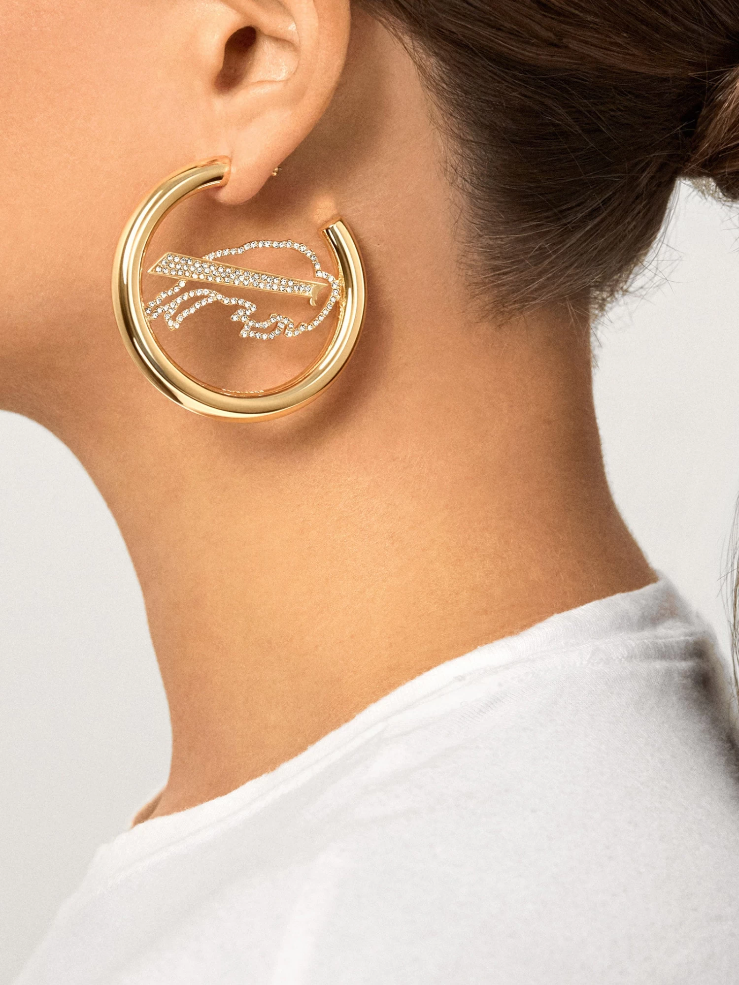 Billieve! Be the most fashionable fan in the stadium wearing the Buffalo Bills Logo Hoops. This classic gold hoop features the Bills’ logo in pretty pavé for extra sparkle.