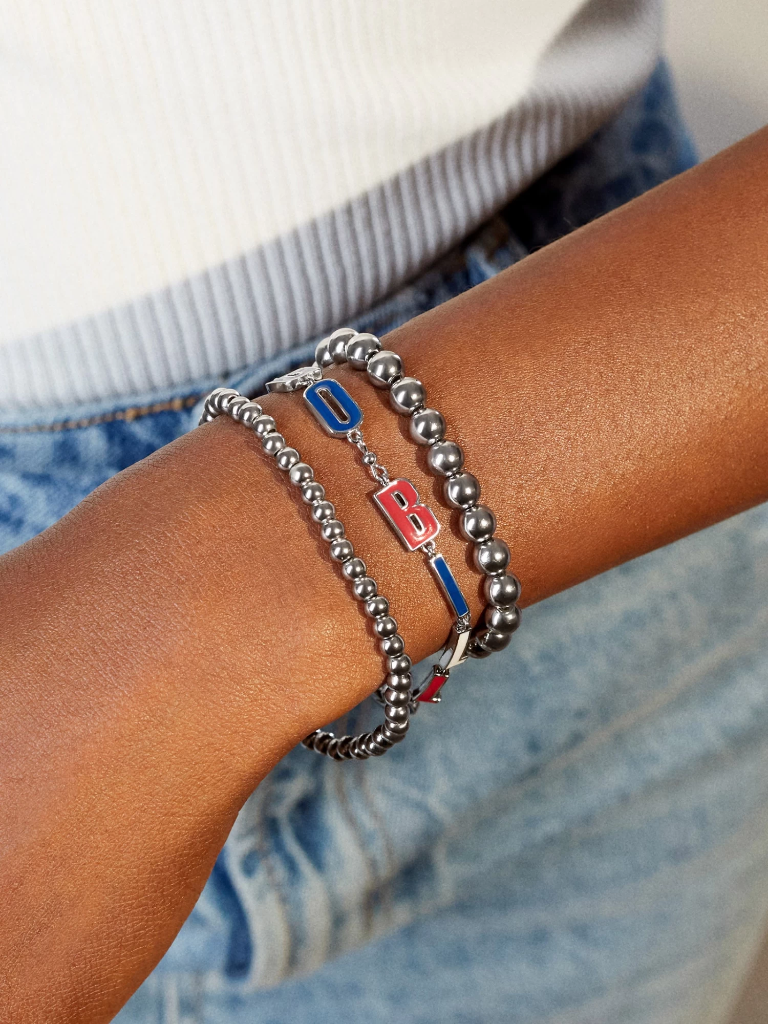 Our NFL Slogan Bracelets are fan gear like you’ve never seen before. The Buffalo Bills Silver Slogan Bracelet features the phrase “Go Bills” in red, white, and blue enamel letter beads. This silver bracelet is topped off with the Bills’ logo on the pull-tie closure.
