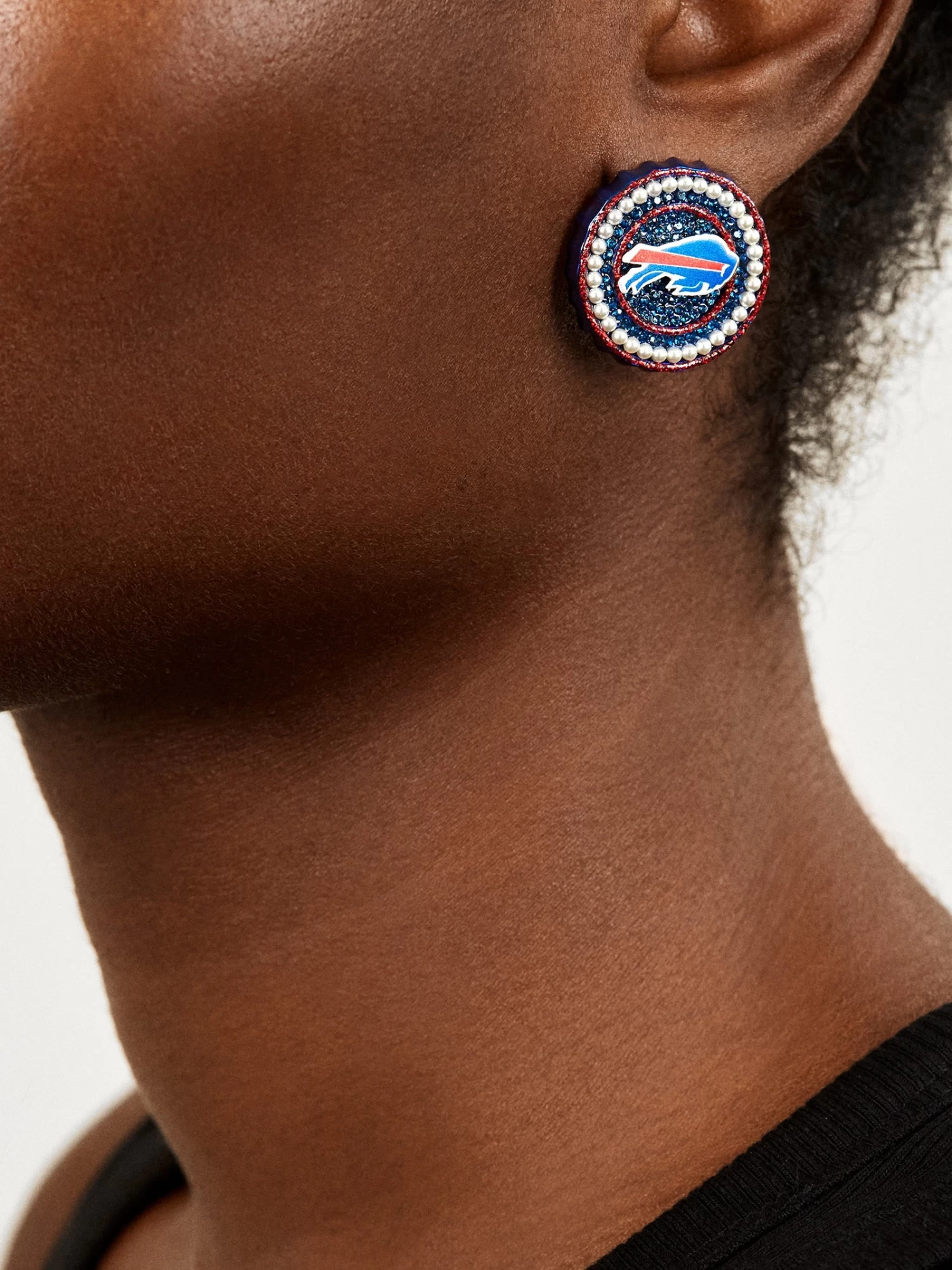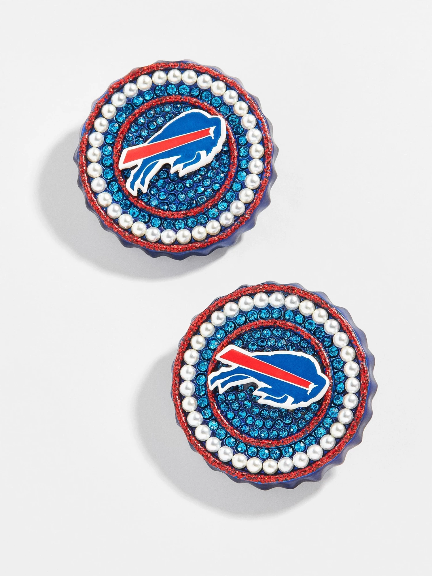 Billieve. Wear your team loud and proud on your lobes. These Buffalo Bills statement studs feature the team’s logo on red enamel and blue gems, plus a touch of pearl for extra detail.