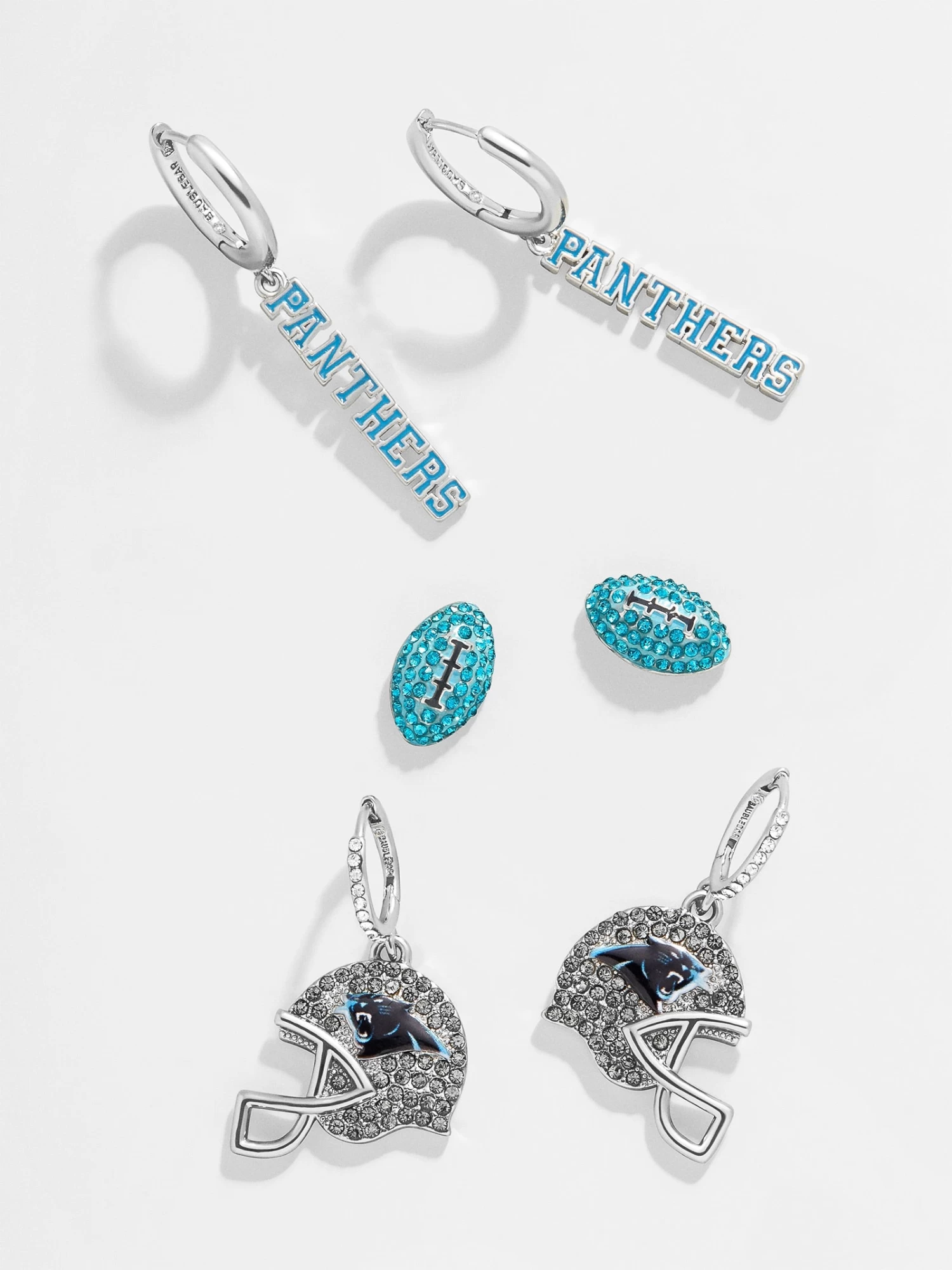 Panthers Pride! Get excited about game day sporting the Carolina Panthers Earring Set. This set contains three pairings: Panther huggies, helmet huggies, and blue football studs.