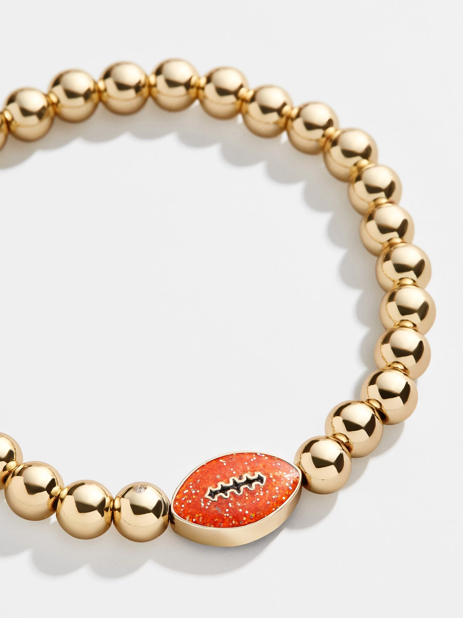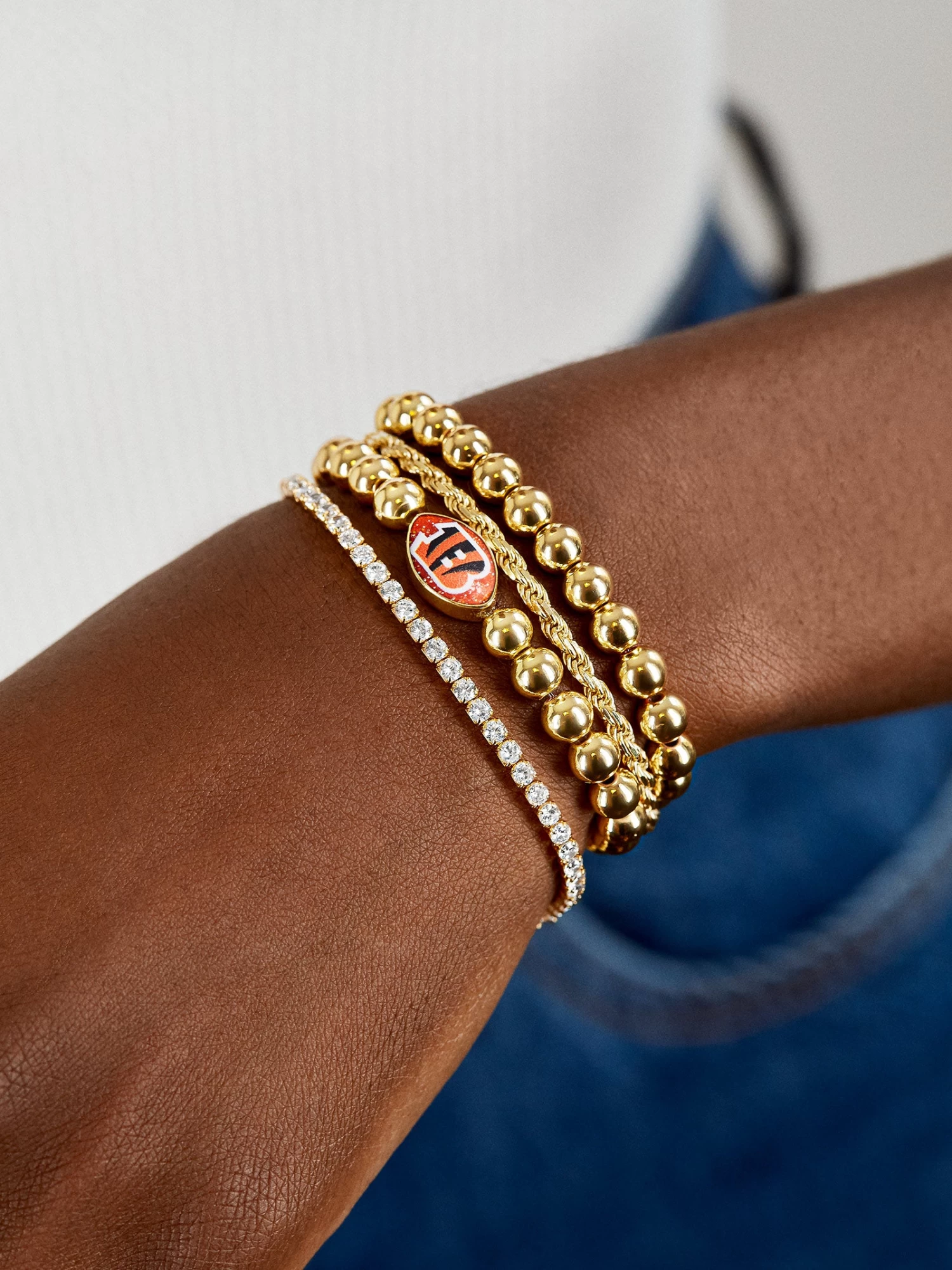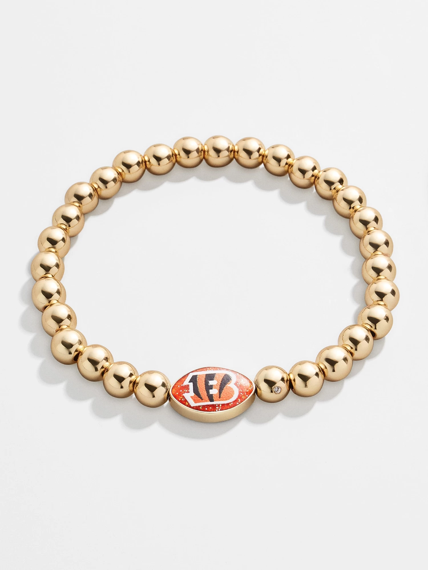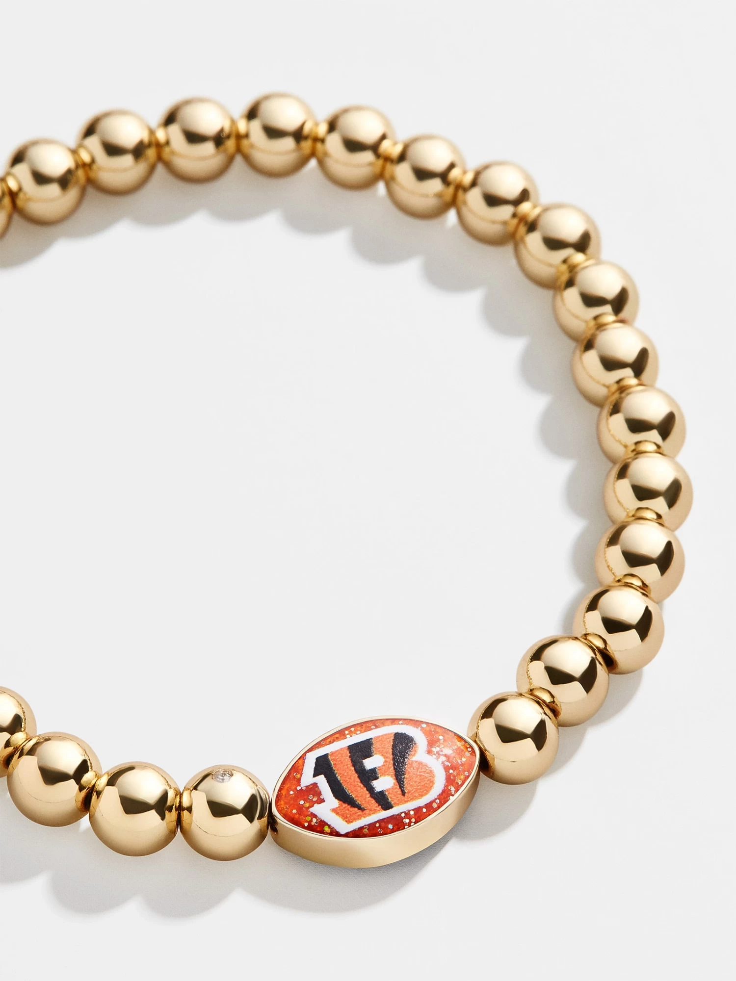 Who Dey! Add a subtle hint of your favorite team to your wrist stack. This Cincinnati Bengals bracelet features a black and orange football bead with the team’s logo on one side. This bracelet features 5mm gold ball beads.