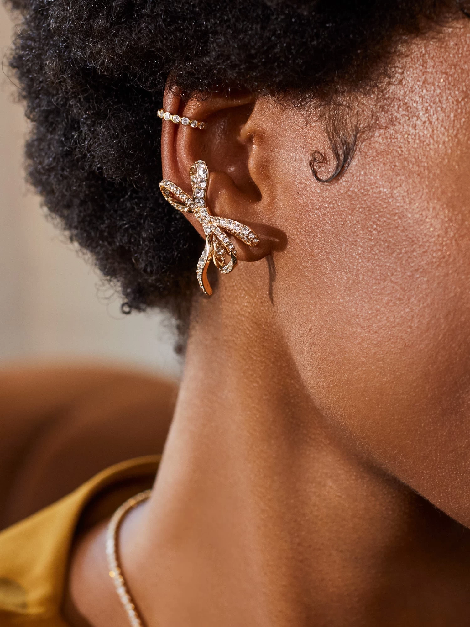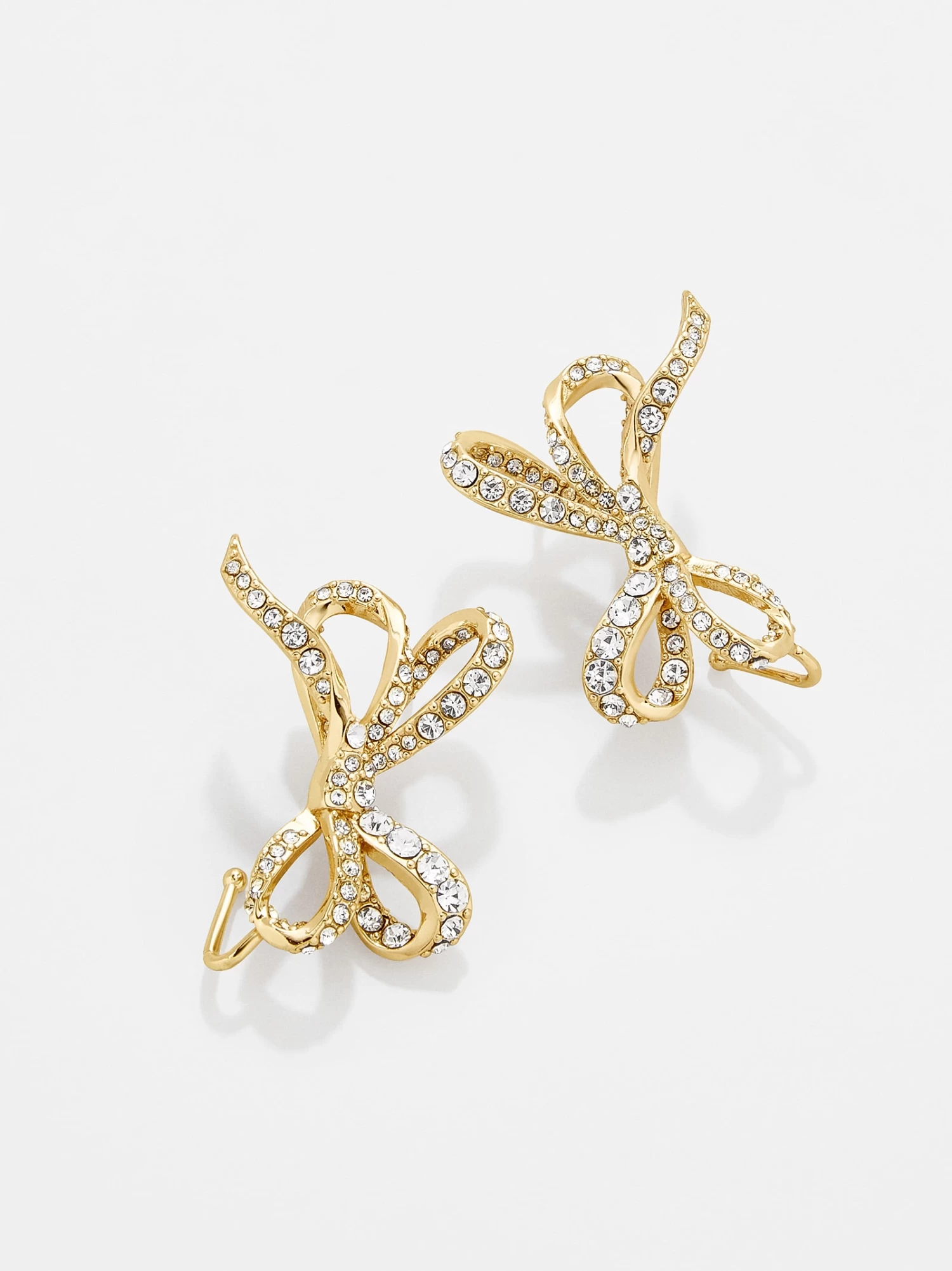Bows are everywhere this season, including in accessories. These statement ear crawlers are a gold and crystal rendition of this classic motif. Delicate metal is twisted to form a double bow with tiny ribbon detailing.