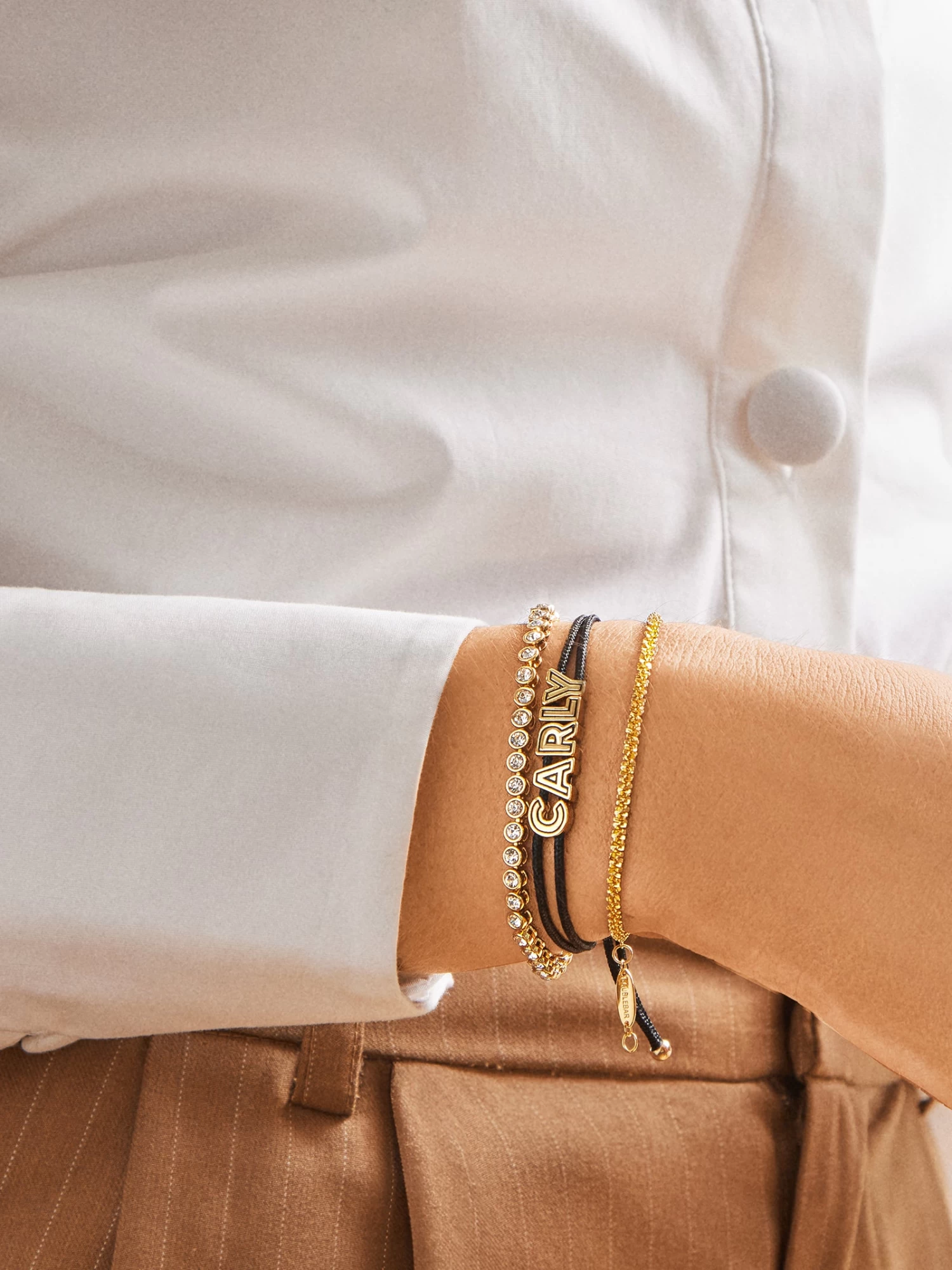 The gold and cord version of our Custom Slider Bracelet is perfect for those looking for something a bit more casual from our Custom Slider Bracelet collection. Subtly textured gold letter beads are slid onto comfortable cord and topped off with an easy-to-wear, adjustable toggle closure. Choose a name, initials, or favorite phrase to customize your bracelet with – it’s sure to be your new everyday staple. See our Letter Key for all options available.