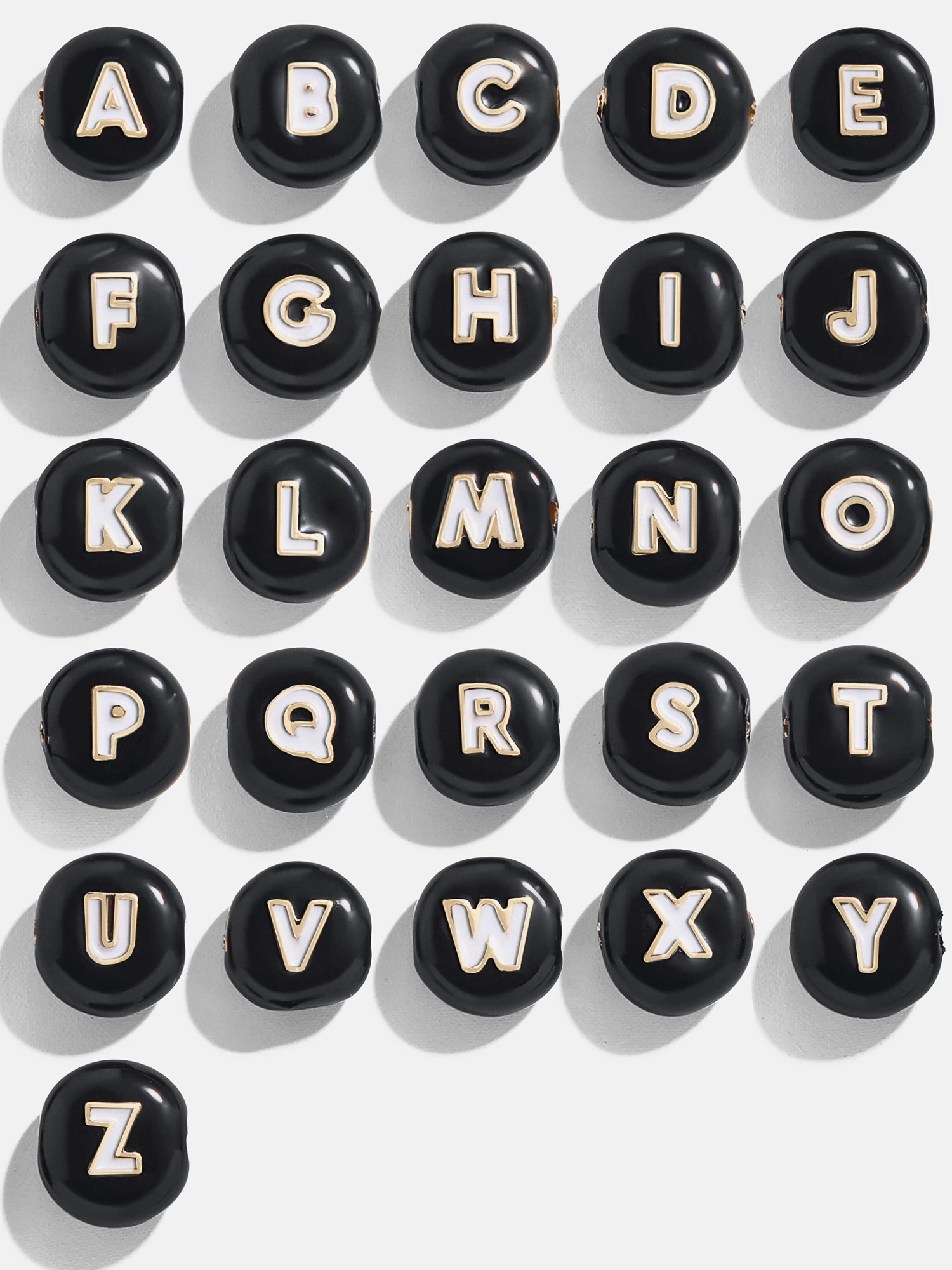 It features black disc beads that spell out whatever suits you. Fill the blank space with a name, phrase, or dip into our symbols for something extra fun.