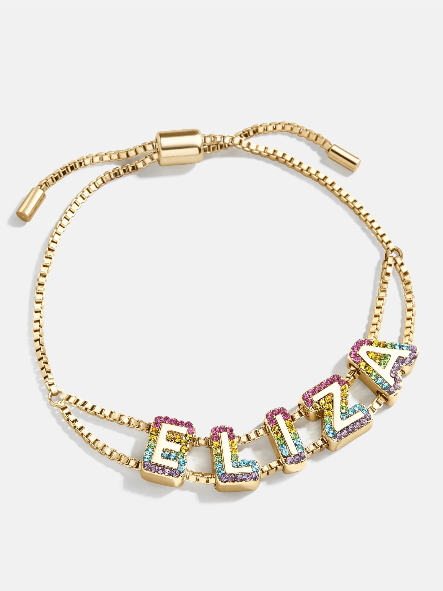The most dazzling of our collection of Custom Slider Bracelets is our Rainbow Ombre style. This special bracelet features two strands of a box chain, an easy-to-adjust pull-tie closure, and vibrant gold and crystal-encrusted beads. Choose a name, initials, or favorite phrase to customize your bracelet with – it’s sure to be your new everyday staple. See our Letter Key for all options available.