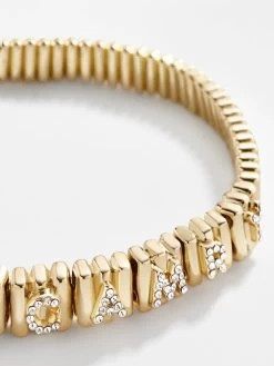 Innovative and out-of-the-box, our Custom Tile Bracelets feature gold beads that create a unique pleated effect. Topped off with fun letter beads of your choice, it’s a must-have in your accessory arsenal. Choose a name, initials, or favorite phrase to customize your bracelet with – it’s sure to be your new everyday staple. See our Letter Key for all options available. Please note, we are unable to produce products with profanity.