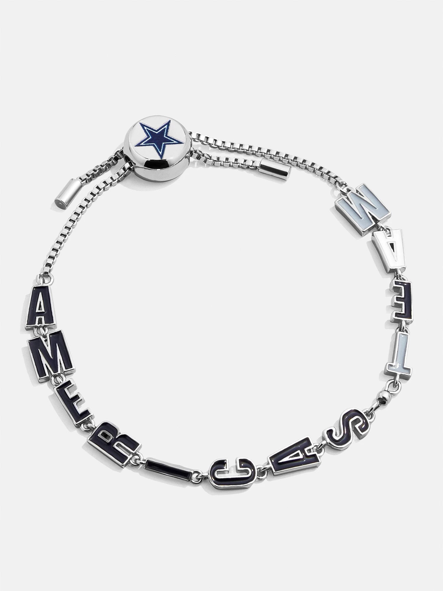 Our NFL Slogan Bracelets are fan gear like you’ve never seen before. The Dallas Cowboys Silver Slogan Bracelet features the phrase “America’s Team” in navy, white, and silver enamel letter beads. This silver bracelet is topped off with the Cowboys’ logo on the pull-tie closure.