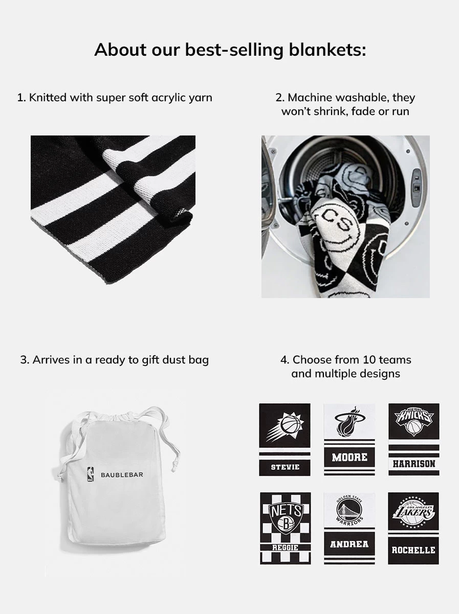 Huddle up! Or shall we say, cuddle up? Our collection of NBA custom blankets is perfect for every basketball season event, whether you’re in the stadium, tailgating, or on the sofa. These also make the perfect gift for any NBA super fan. Add a name, initials, or favorite phrase to the blanket of your team of choice and use it for years to come. Please note, we’re unable to produce blankets with profanity. Please check the product details for measurements.