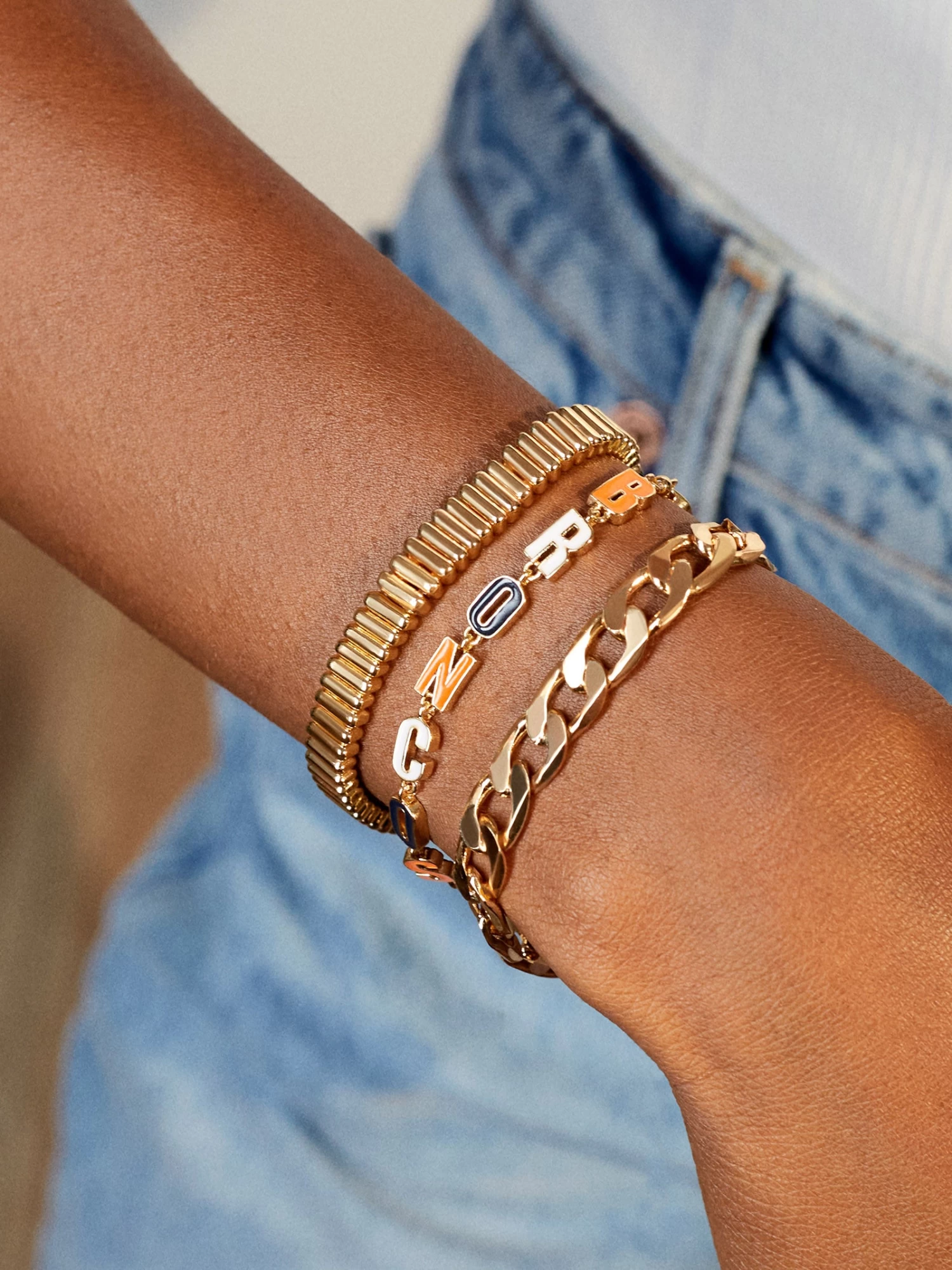 Our NFL Slogan Bracelets are fan gear like you’ve never seen before. The Denver Broncos Gold Slogan Bracelet features the phrase “Go Broncos” in navy, orange, and white enamel letter beads. This gold bracelet is topped off with the Broncos’ logo on the pull-tie closure.