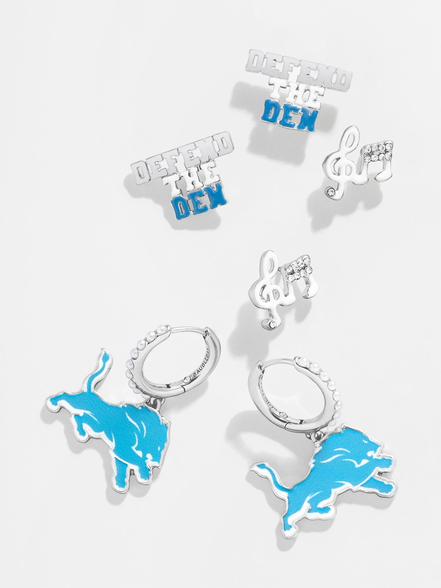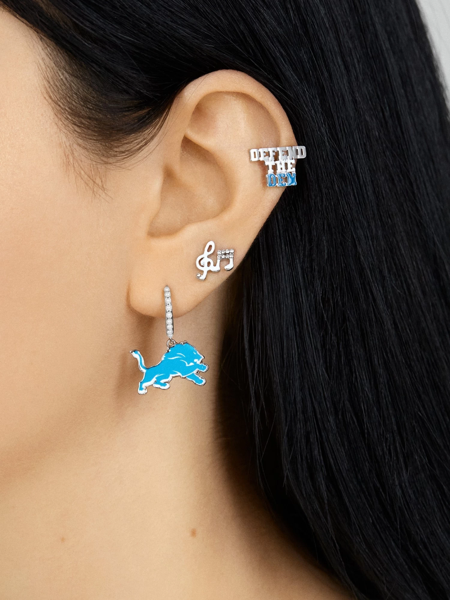 This Is One Pride! Celebrate your team in style wearing the Detroit Lions Earring Set. This set contains three pairings: Lions logo huggies, “Defend The Den” huggies, and music note studs.
