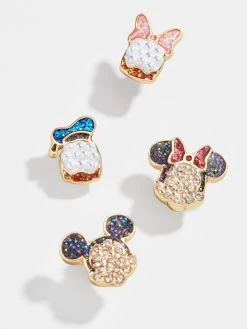 Wear your favorite characters every single day. Our Friends Forever four-piece piece stud set features Daisy Duck, Donald Duck, Minnie Mouse, and Mickey Mouse. The Daisy Duck and Donald Duck set feature pretty pearls, while the Mickey Mouse and Minnie Mouse pair has sleek pavé. Did we mention? This set is crafted with 18K gold plated sterling silver and Cubic Zirconia stones.