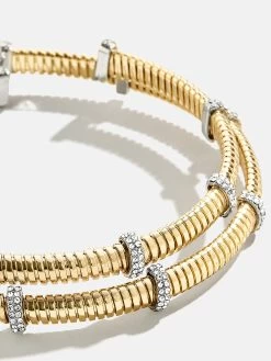 For those who like mixed mediums in their bracelet stack, we designed the Eve Cuff Bracelet. This piece looks like two layers when in reality it’s one complete cuff, giving the illusion of stacking without all the hassle. Better yet, this bracelet features glass stones throughout, adding even more interest to this one-of-a-kind accessory.