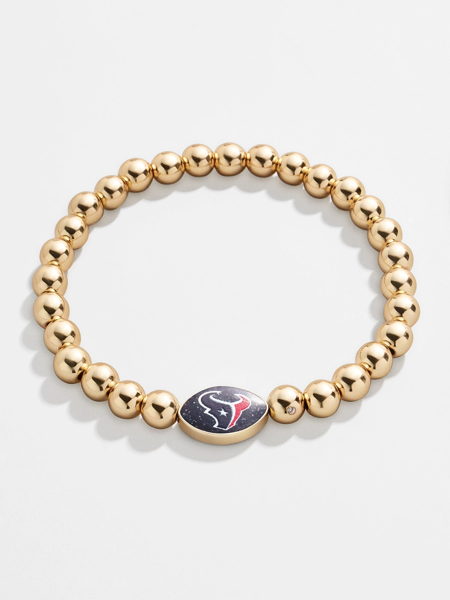 We Are Texans! Add a subtle hint of your favorite team to your wrist stack. This Houston Texans bracelet features a blue and red football bead with the team’s logo on one side. This bracelet features 5mm gold ball beads.