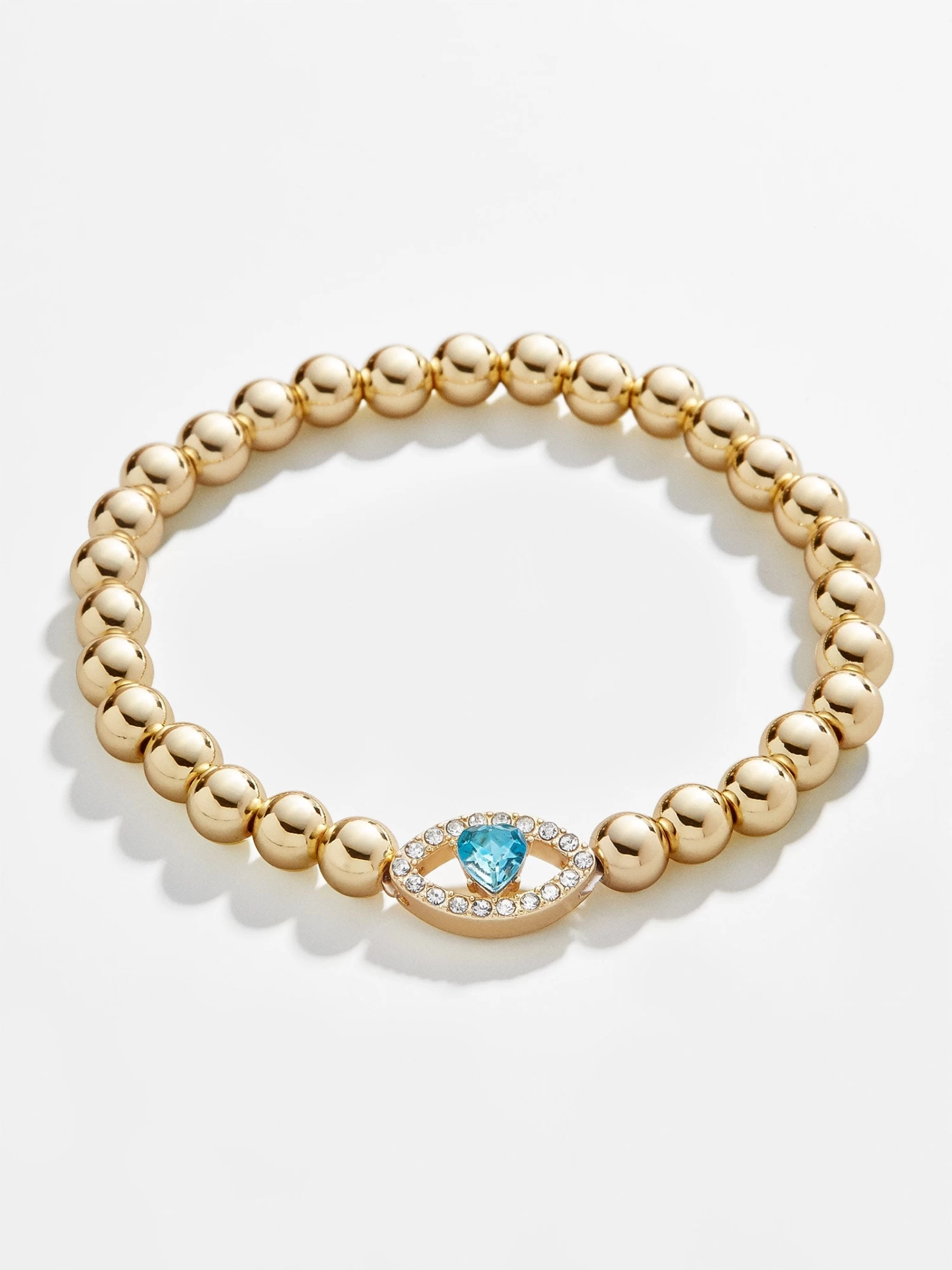 The Iris Pisa Bracelet features a pavé evil eye bead with blue accents flanked with classic gold beads. This bracelet features 6mm gold ball beads.