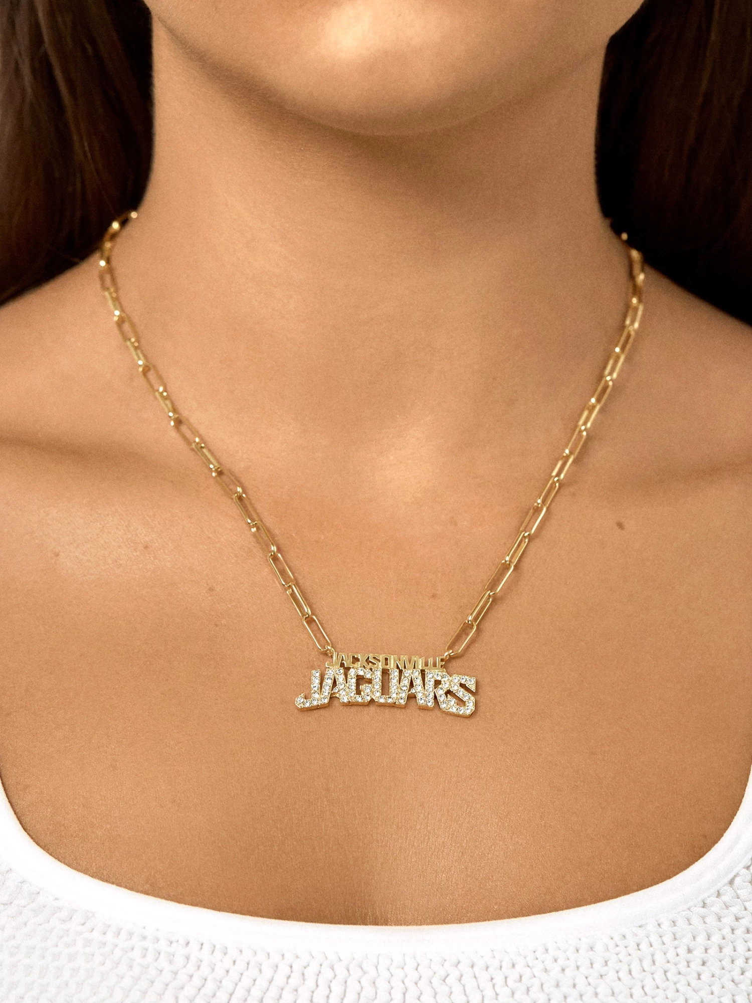 Duuuval! No necklace stack would be complete without a little team spirit. This Jacksonville Jaguars gold chain nameplate features a subtle hint of pavé for a little extra shine on game day.