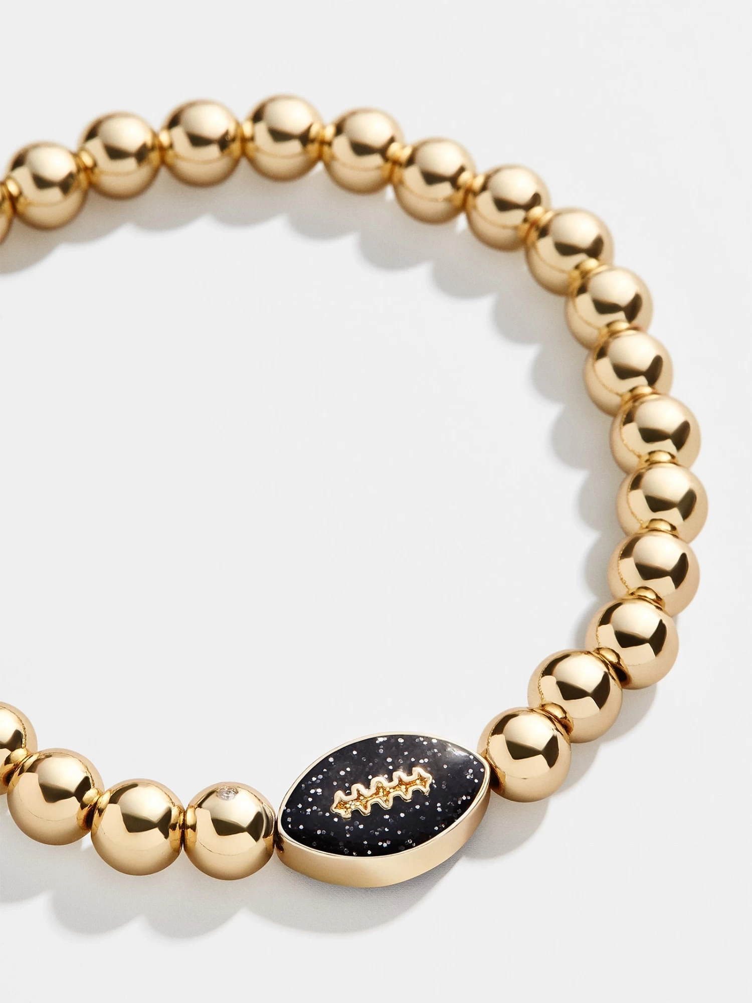 Duuuval! Add a subtle hint of your favorite team to your wrist stack. This Jacksonville Jaguars bracelet features a teal and gold football bead with the team’s logo on one side. This bracelet features 5mm gold ball beads.
