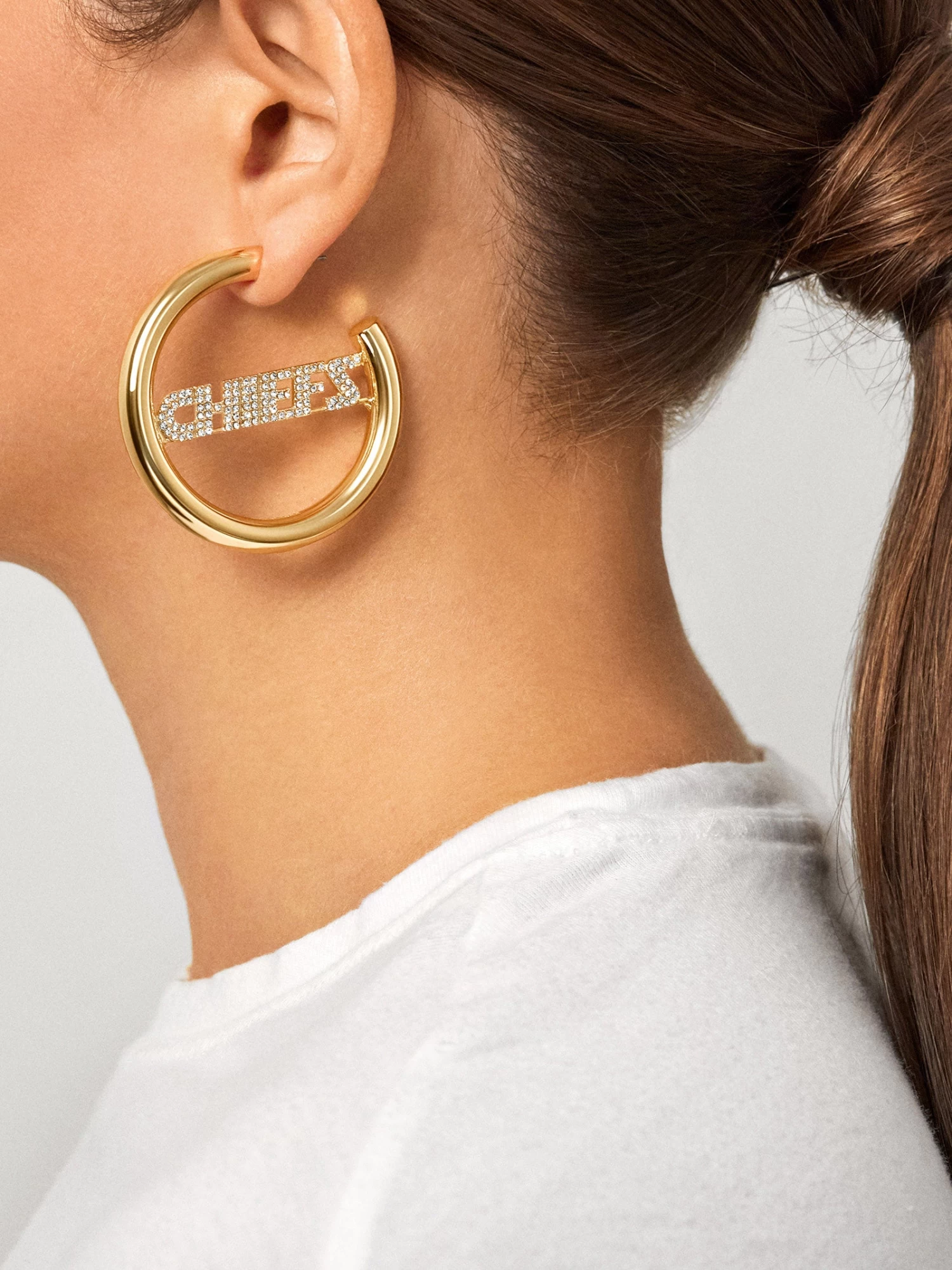 Best worn in Chief’s Kingdom. Be the most fashionable fan in the stadium wearing the Kansas City Chiefs Logo Hoops. This classic gold hoop features the Chiefs’ logo in pretty pavé for extra sparkle.