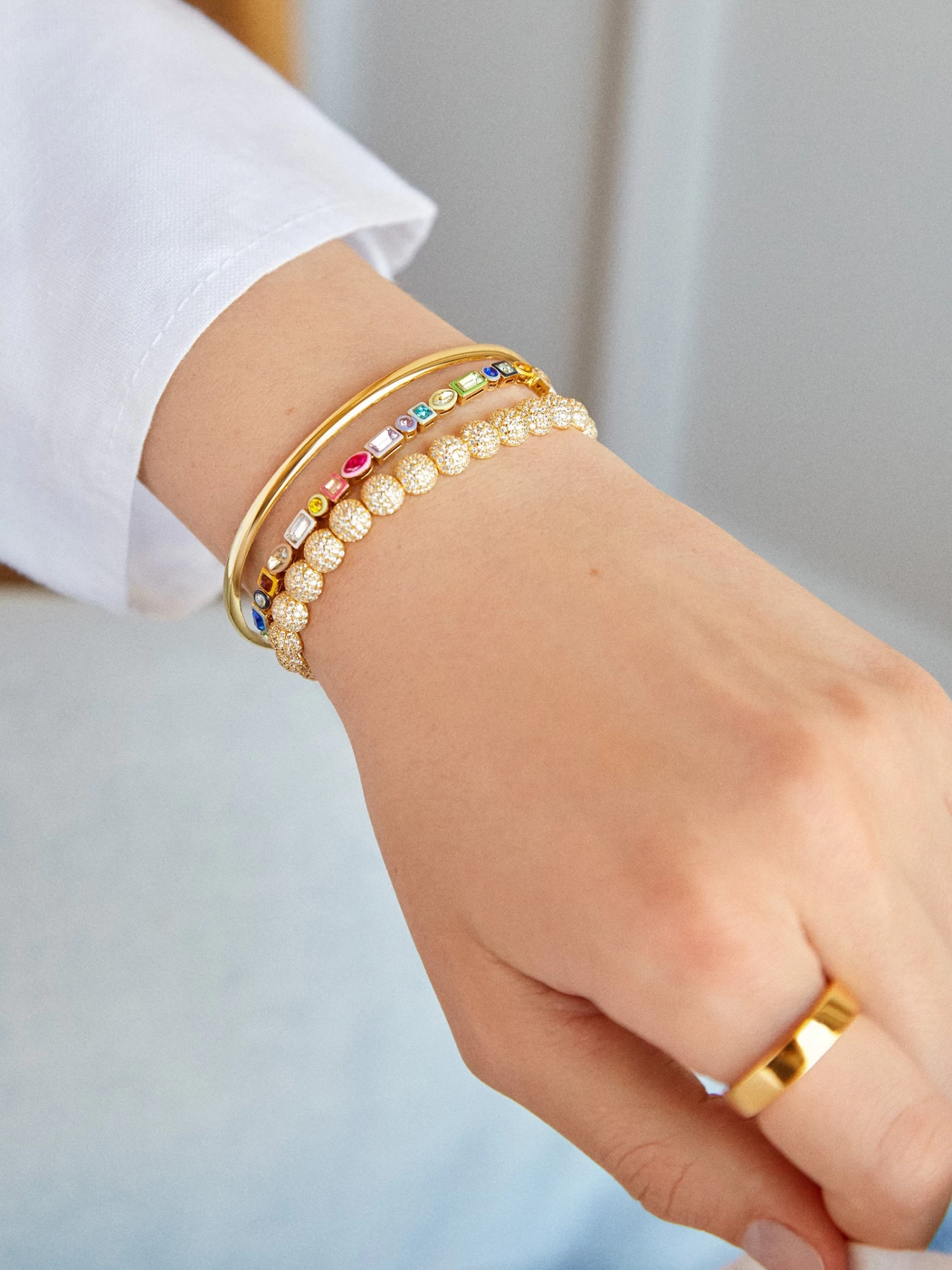 The Kayden Bracelet in rainbow is crafted in a super vibrant color palette. Mixed-shape gems are bound together to create an extra interesting eternity bracelet design. Each is topped off with matching colorful enamel, ensuring that this piece will add a pop of color to every single outfit you put together.
