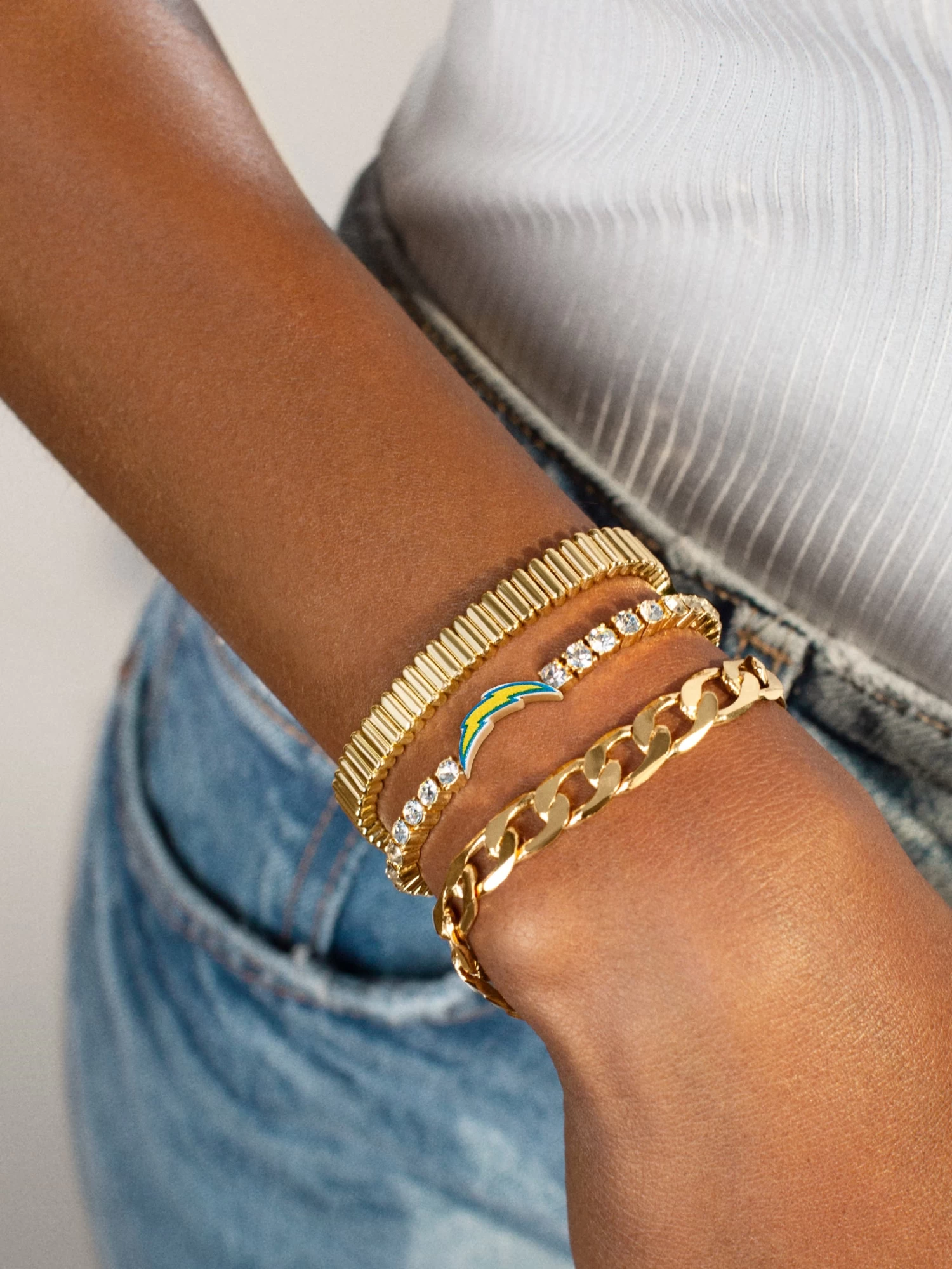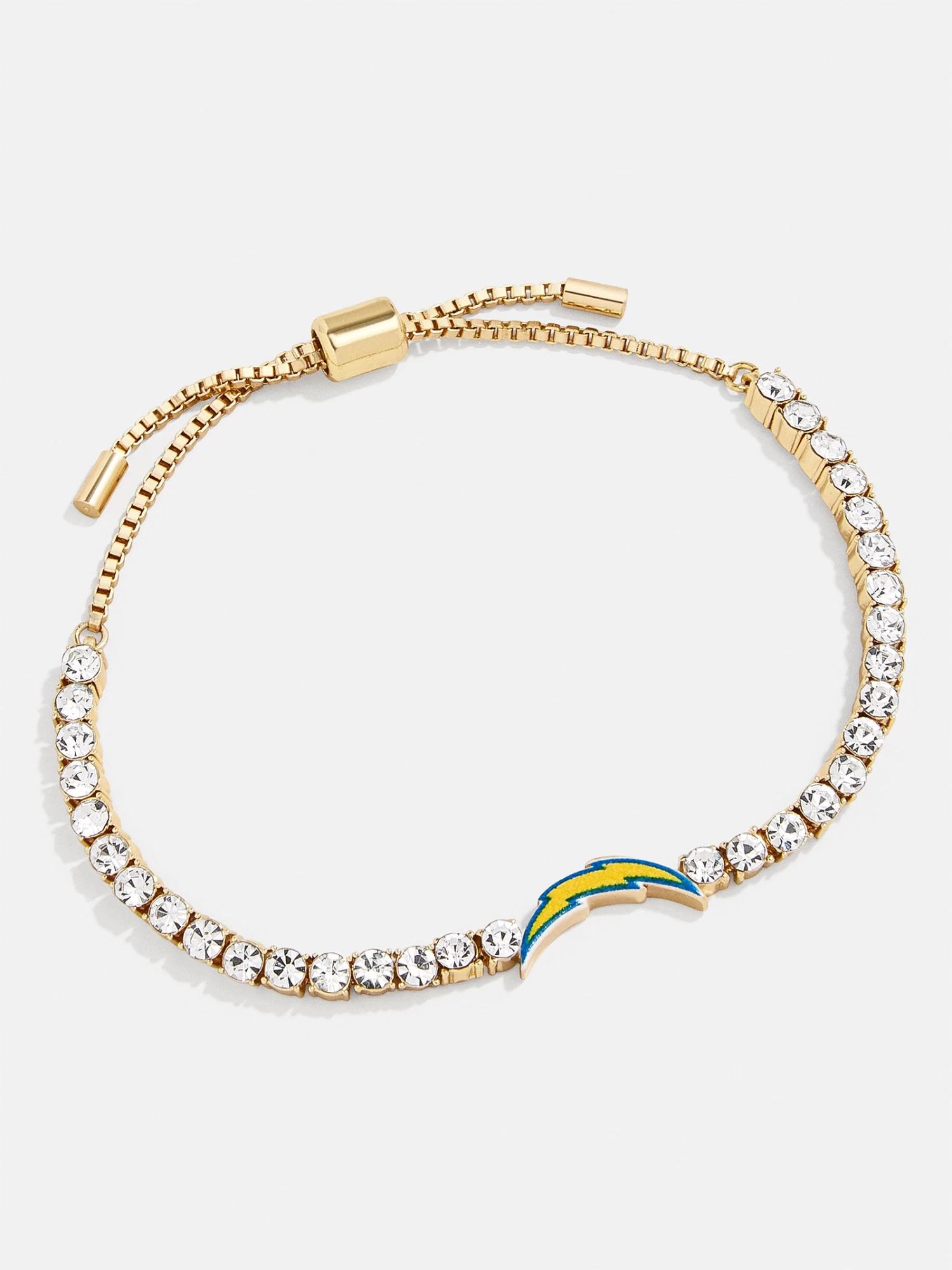 Our NFL tennis bracelets bring fashion to football. The Los Angeles Chargers Gold Tennis Bracelet features the Chargers’ logo flanked by an eternity band of crystals and gold hardware. Better yet, this design is complete with a pull-tie closure, ensuring the perfect wrist fit for game day (and every day).