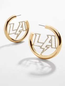 Perfect for the Chargers House. Be the most fashionable fan in the stadium wearing the Los Angeles Chargers Logo Hoops. This classic gold hoop features the Charger’s logo in pretty pavé for extra sparkle.