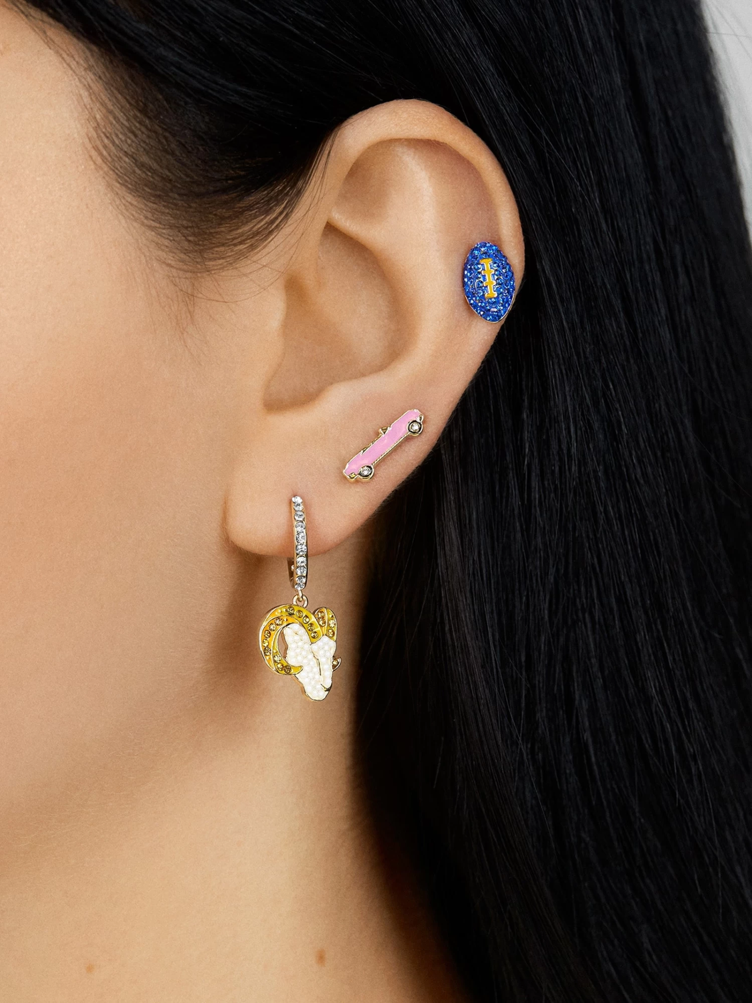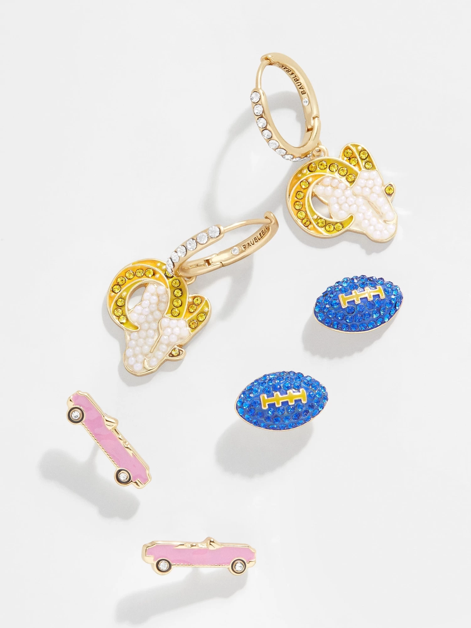 These are perfect for the Rams House. This earring set contains three pairings: Rams logo huggies, football studs, and pink convertible studs.