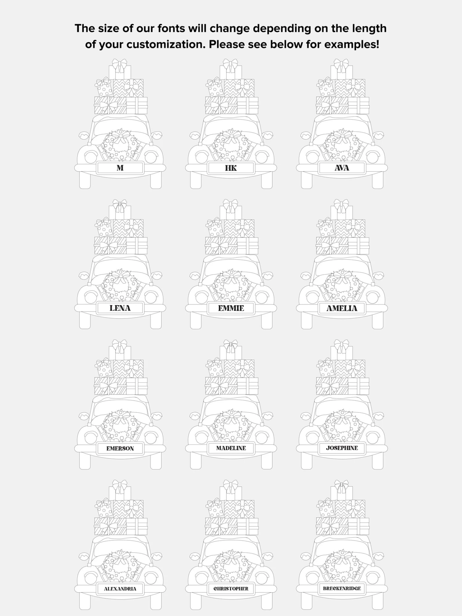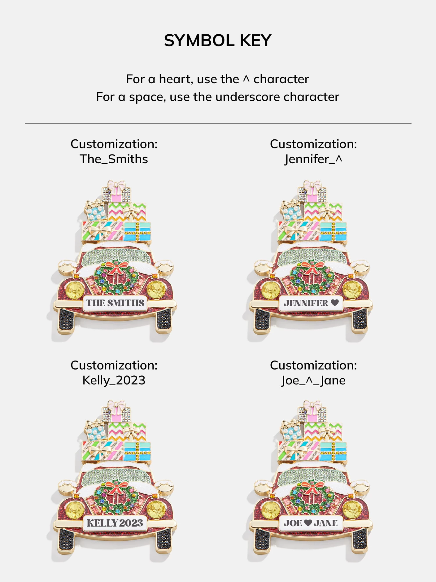Add something that shines to your tree this year. A beautifully hand painted one-of-a-kind custom car ornament features a printed license plate with words to fit the customization of your choice.