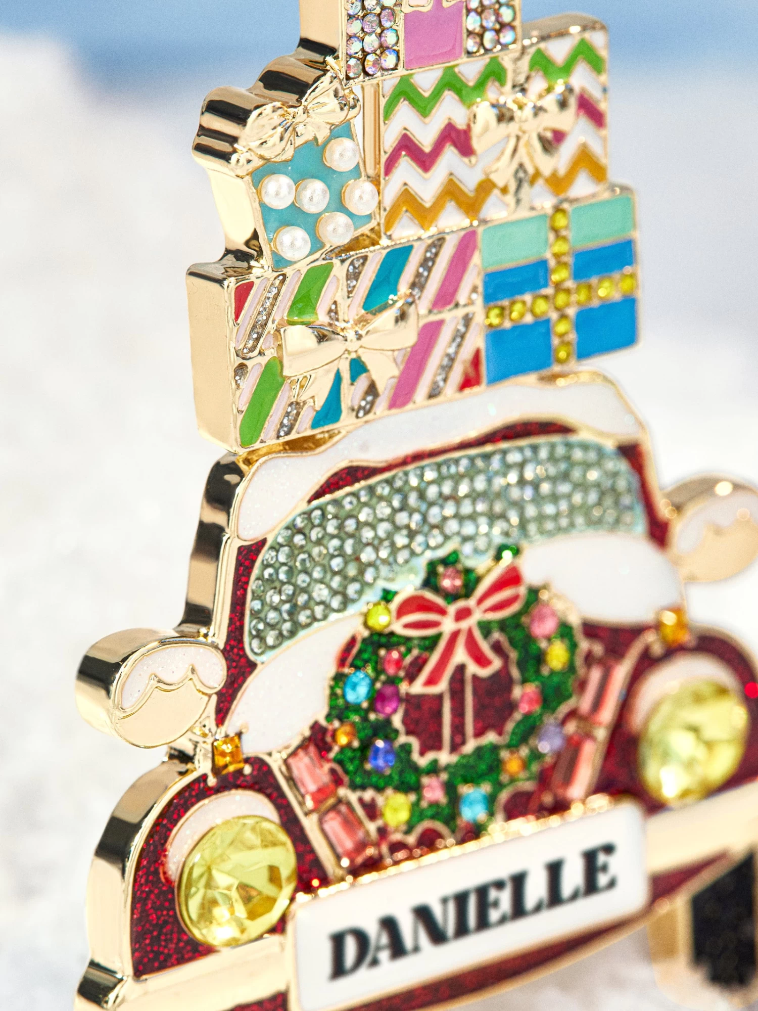 1. All in the details: A hand painted shiny enamel car decorated with hand set stones creates the perfect sparkling ornament for your tree. The colors are hand mixed to achieve the perfect vibrant shade and the stones are hand set to make your customization pop.