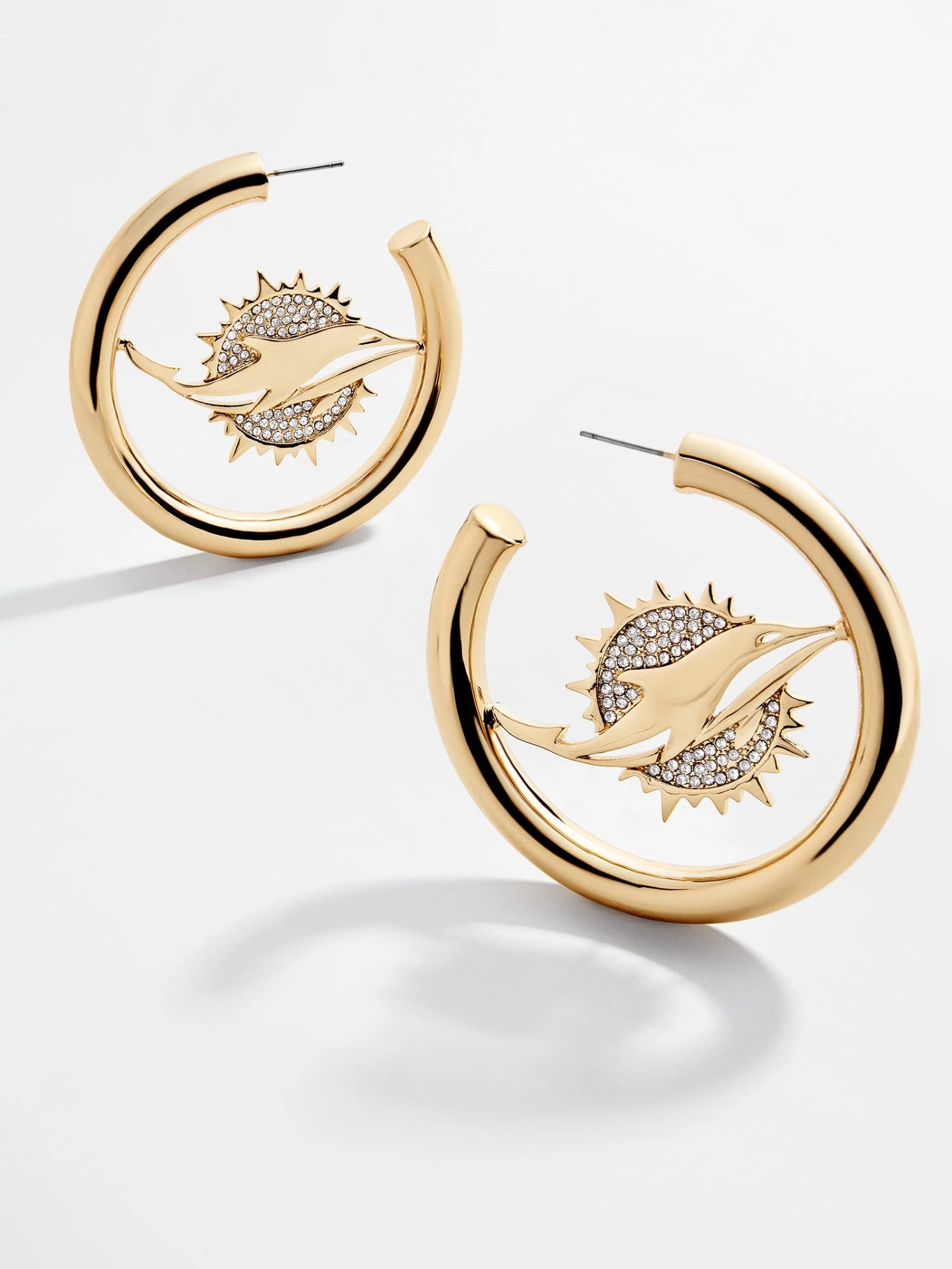Go Fins! Be the most fashionable fan in the stadium wearing the Miami Dolphins Logo Hoops. This classic gold hoop features the Dolphins’ logo in pretty pavé for extra sparkle.
