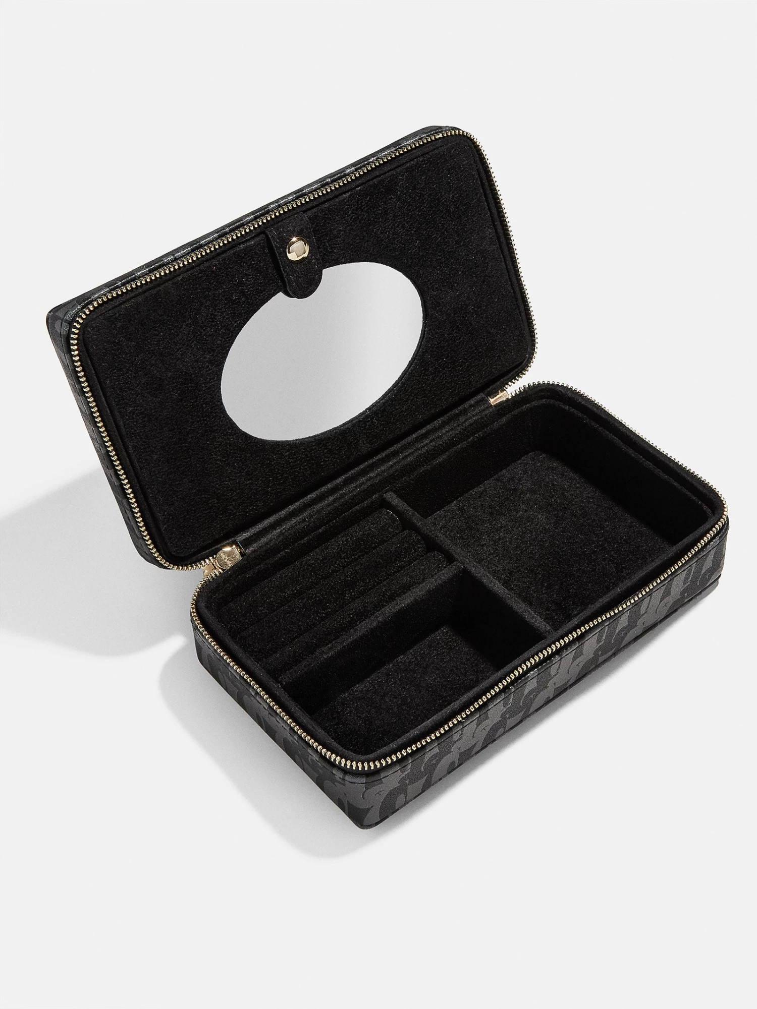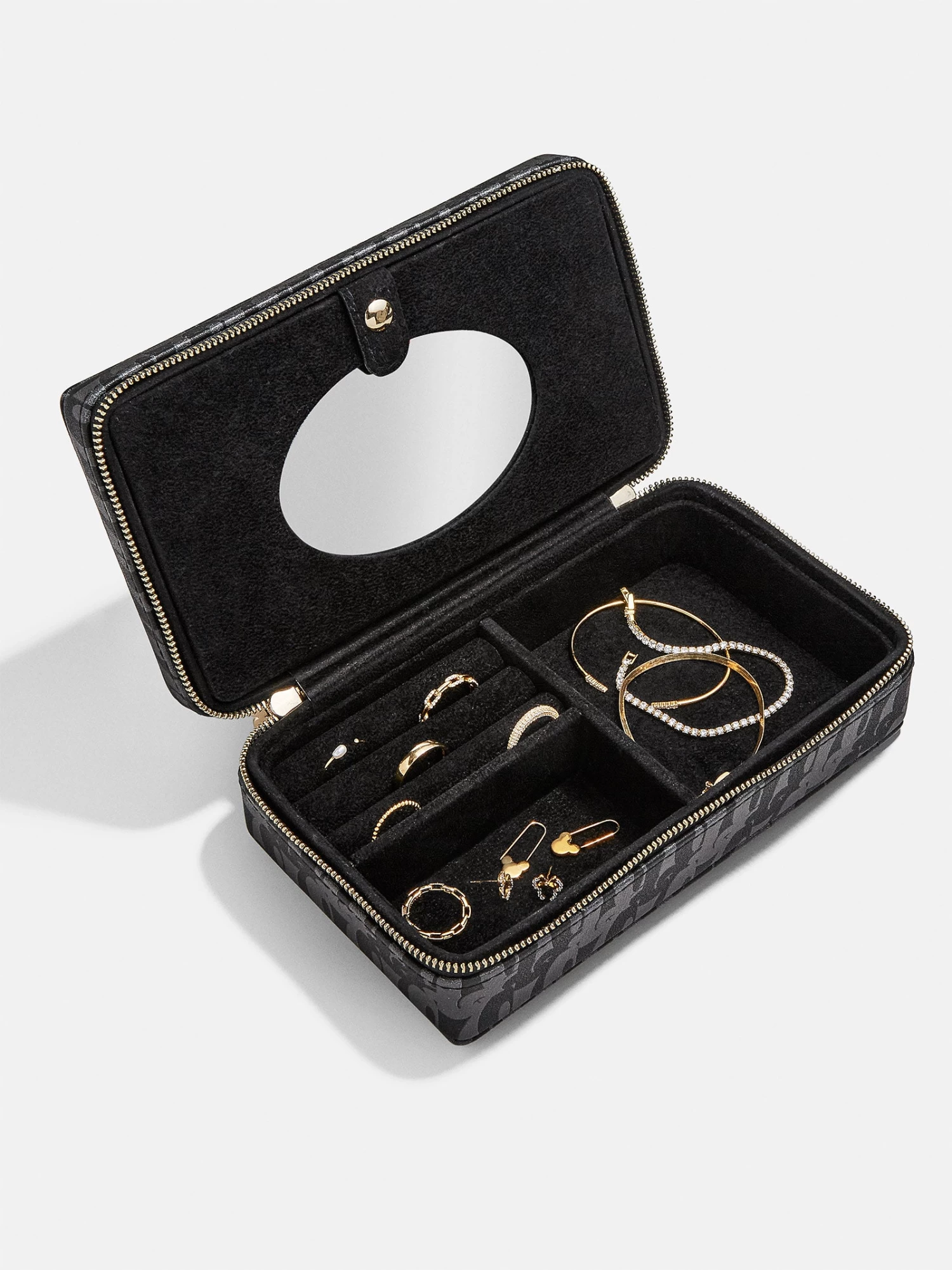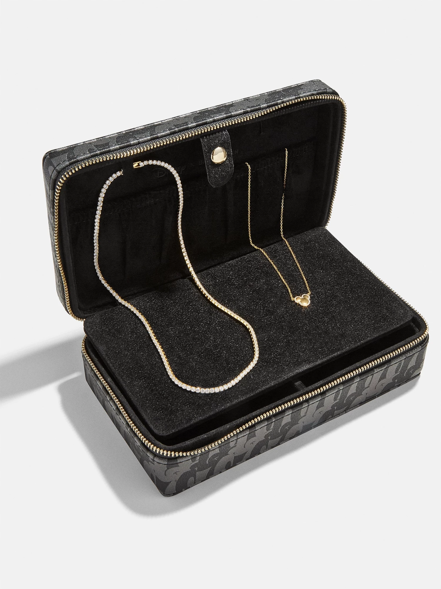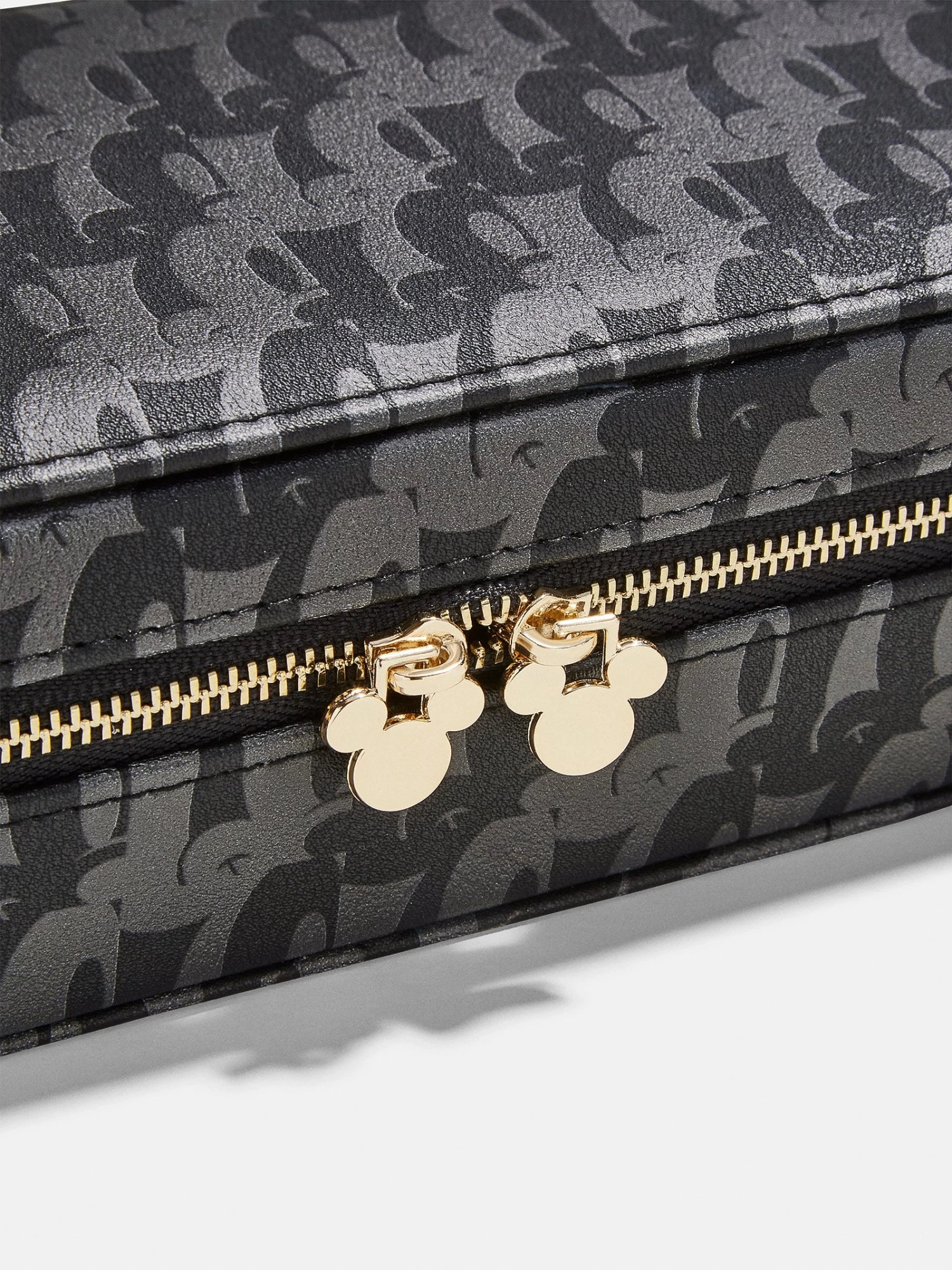 Keep organized with the help of your favorite character. The Mickey Mouse Disney On Repeat Storage Case features a chic, repeating Mickey Mouse pattern. Inside, there are sections that perfectly hold rings, bracelets, necklaces, and earrings. To top it off, this storage case features a gold Mickey Mouse zipper. This case is perfect for both traveling or simply keeping on your dresser.