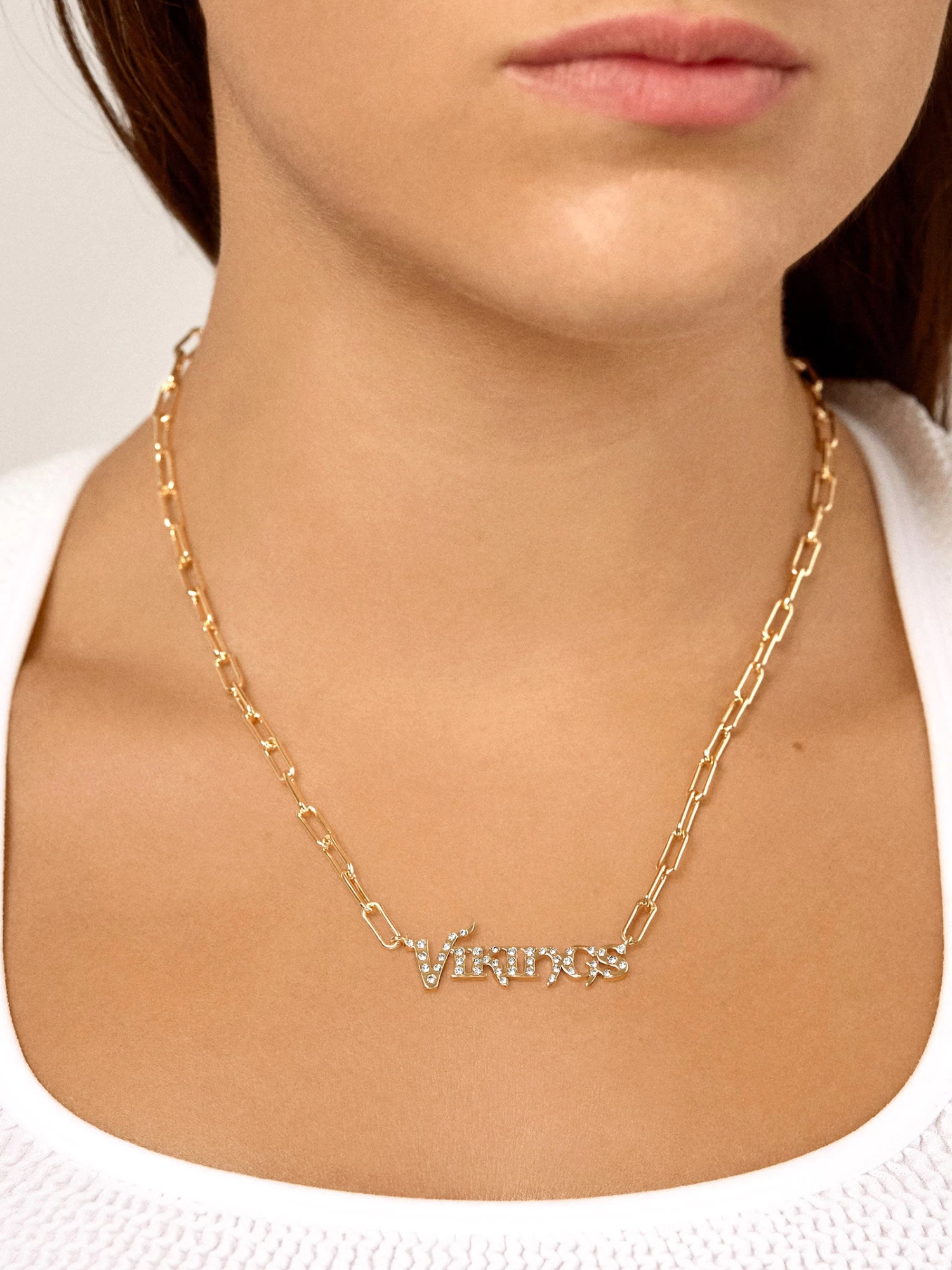Defend the North! No necklace stack would be complete without a little team spirit. This Minnesota Vikings gold chain nameplate features the team’s written logo with a little added sparkle for extra detail.
