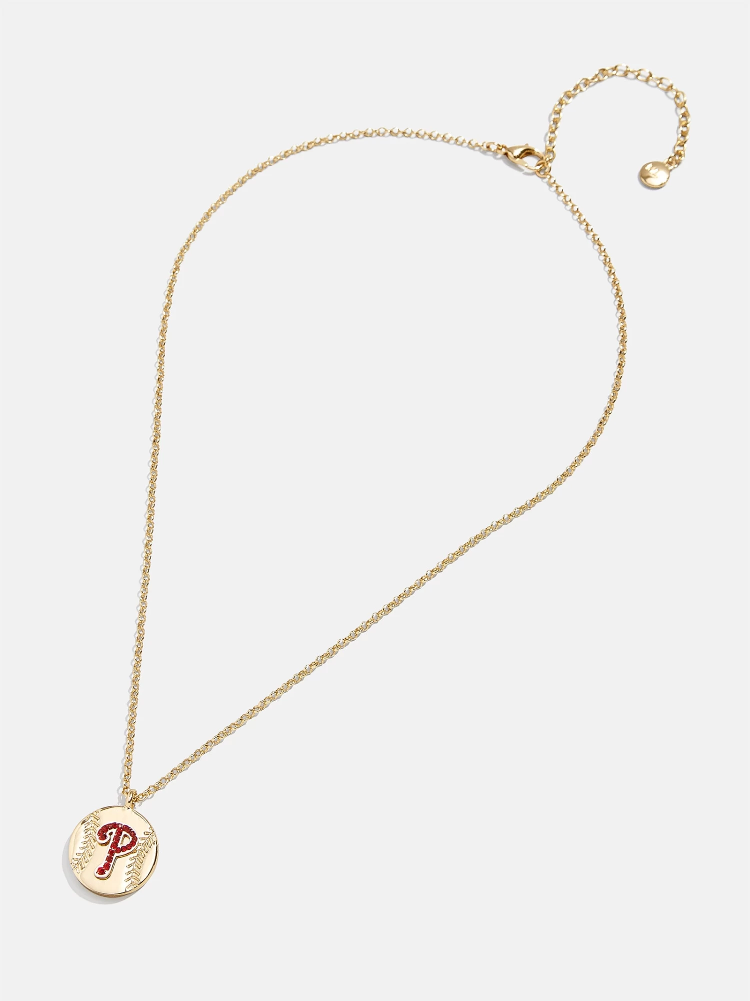 The Philadelphia Phillies MLB Gold Baseball Charm Necklace features the Phillies’ logo on a disc pendant. The pendant features gold details that invoke the design of a baseball. The charm is then strung on a classic gold chain.