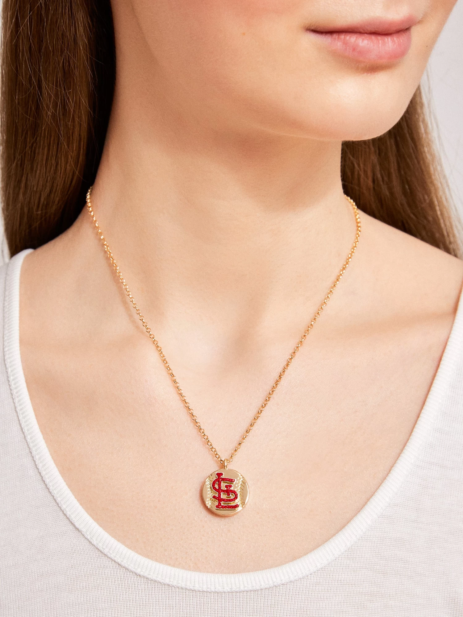 The St. Louis Cardinals MLB Gold Baseball Charm Necklace features the Cardinals’ logo on a disc pendant. The pendant features gold details that invoke the design of a baseball. The charm is then strung on a classic gold chain.