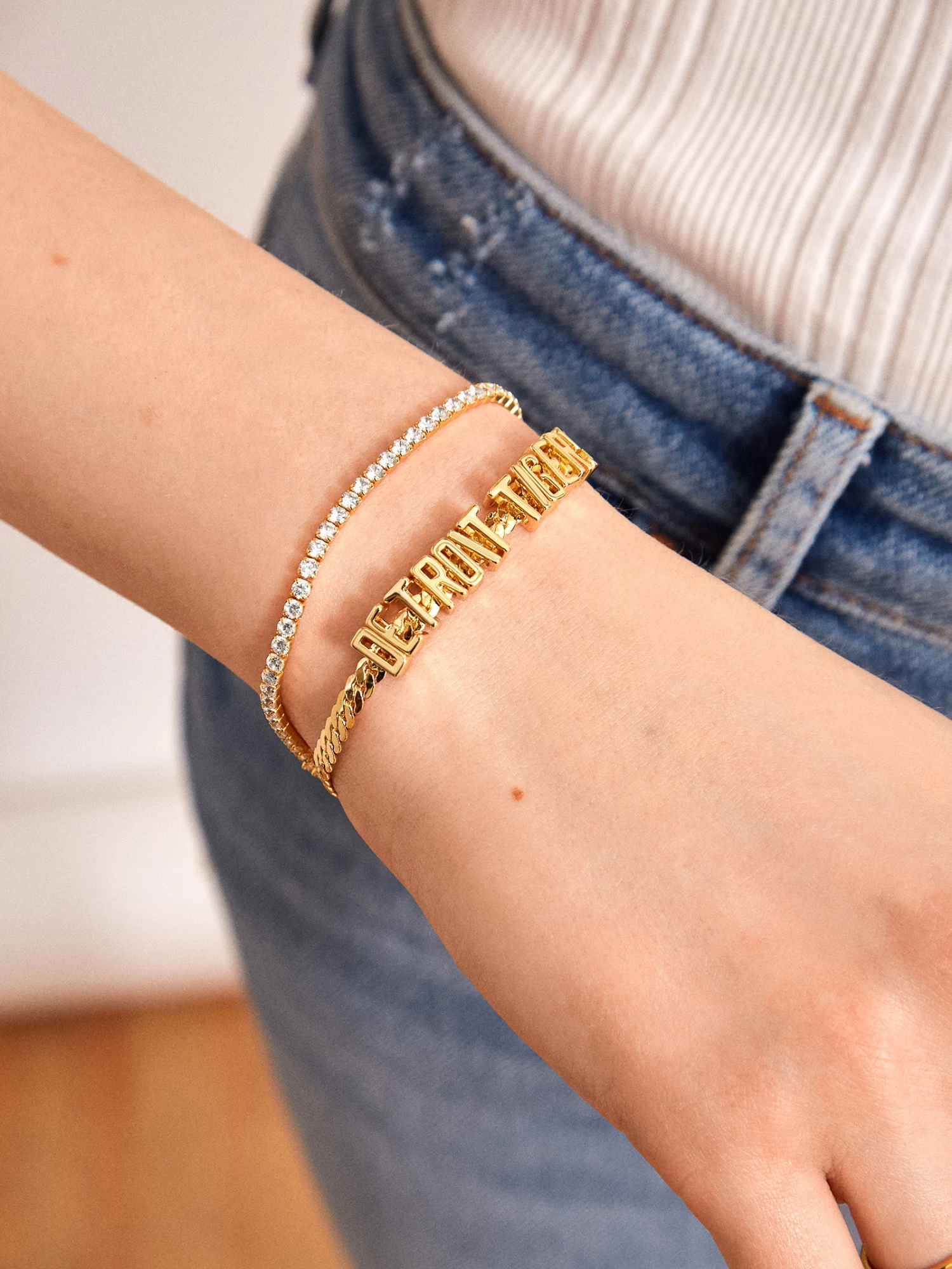 Sleek sportsmanship is the name of the game this baseball season. The Detroit Tigers MLB Gold Curb Chain Bracelet features the Tigers logo in the center flanked by on-trend gold curb chain.