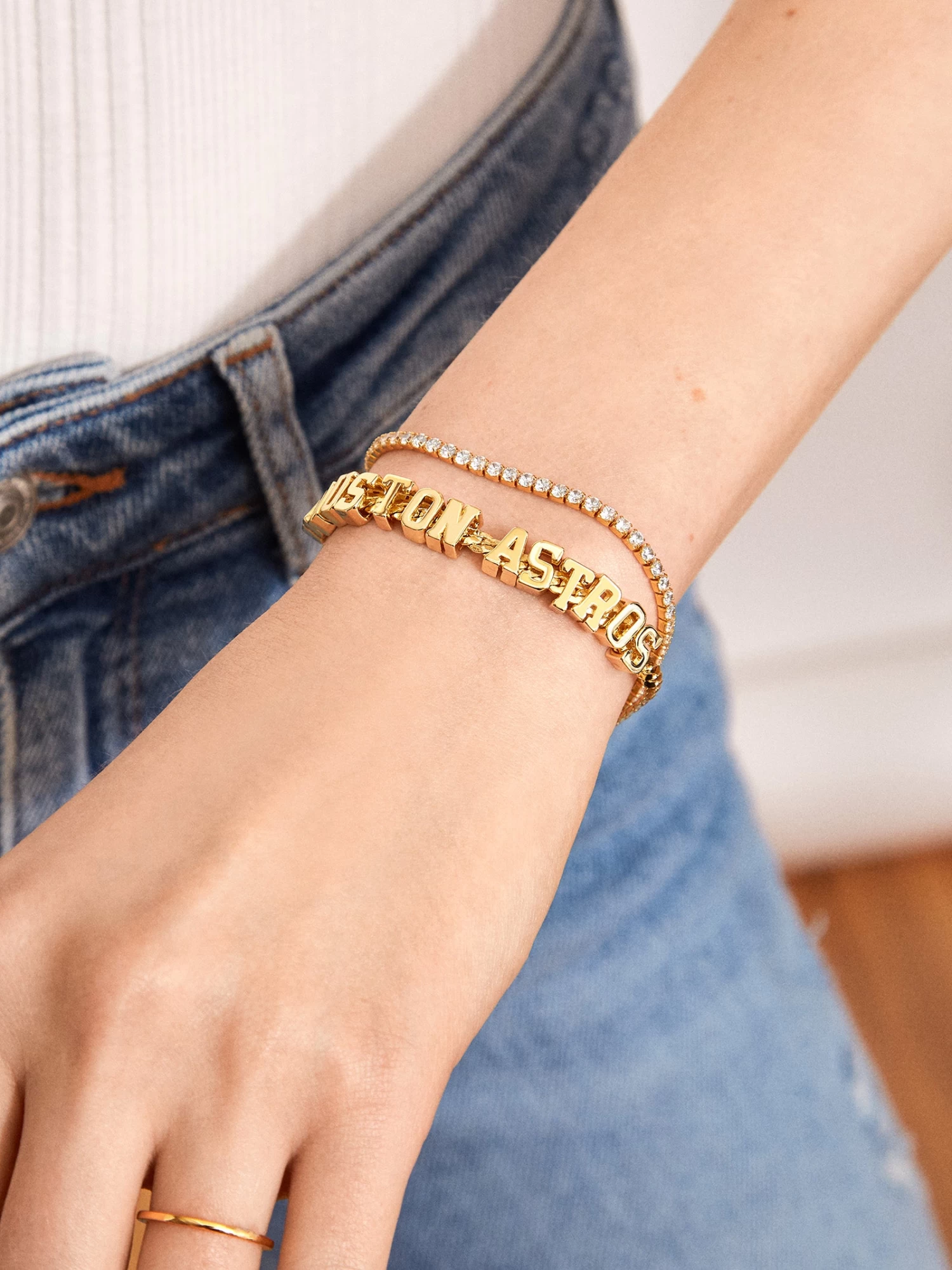 Sleek sportsmanship is the name of the game this baseball season. The Houston Astros MLB Gold Curb Chain Bracelet features the Astros’ logo in the center flanked by on-trend gold curb chain.