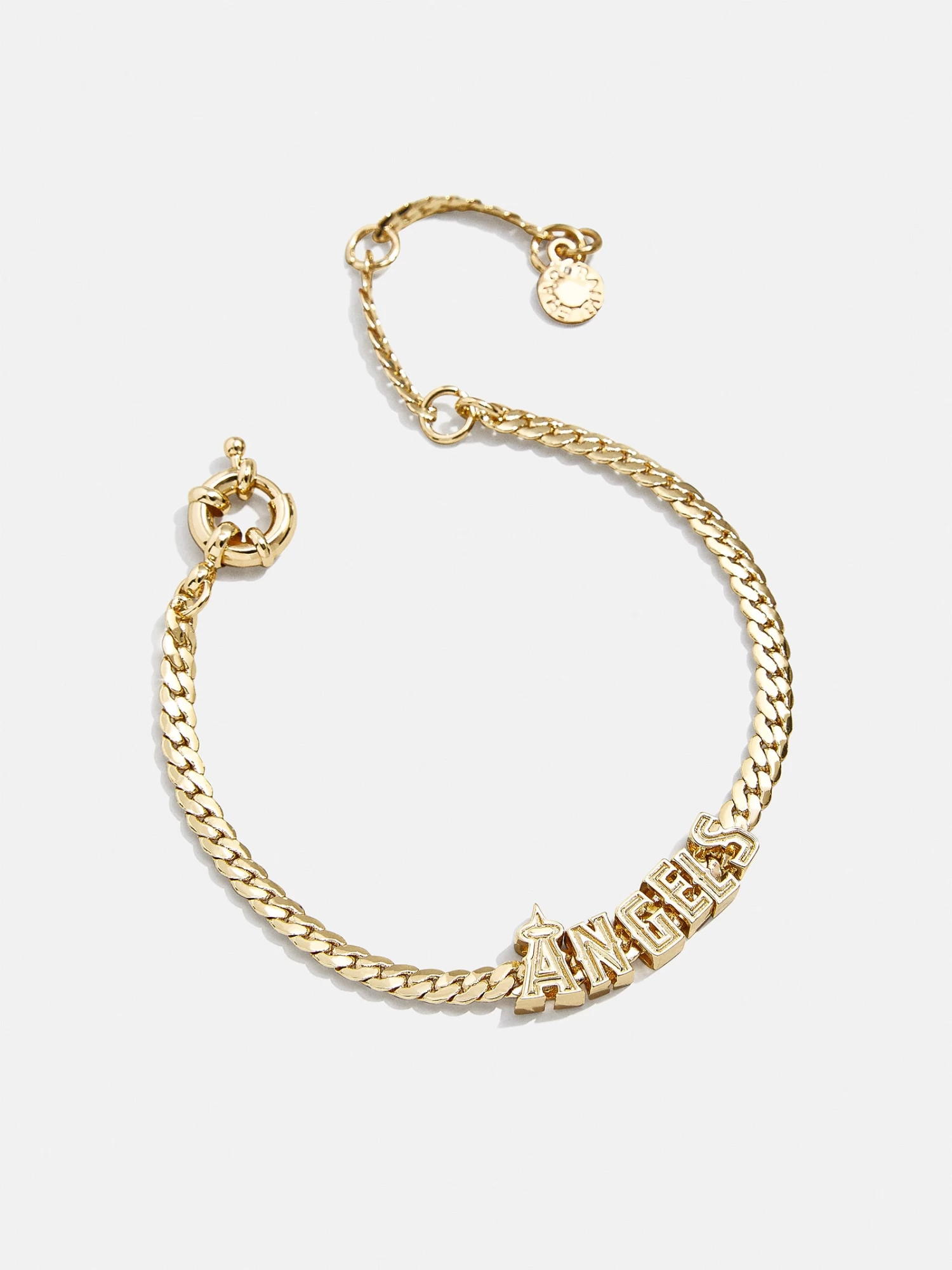 Sleek sportsmanship is the name of the game this baseball season. The Los Angeles Angels MLB Gold Curb Chain Bracelet features the Angels’ logo in the center flanked by on-trend gold curb chain.