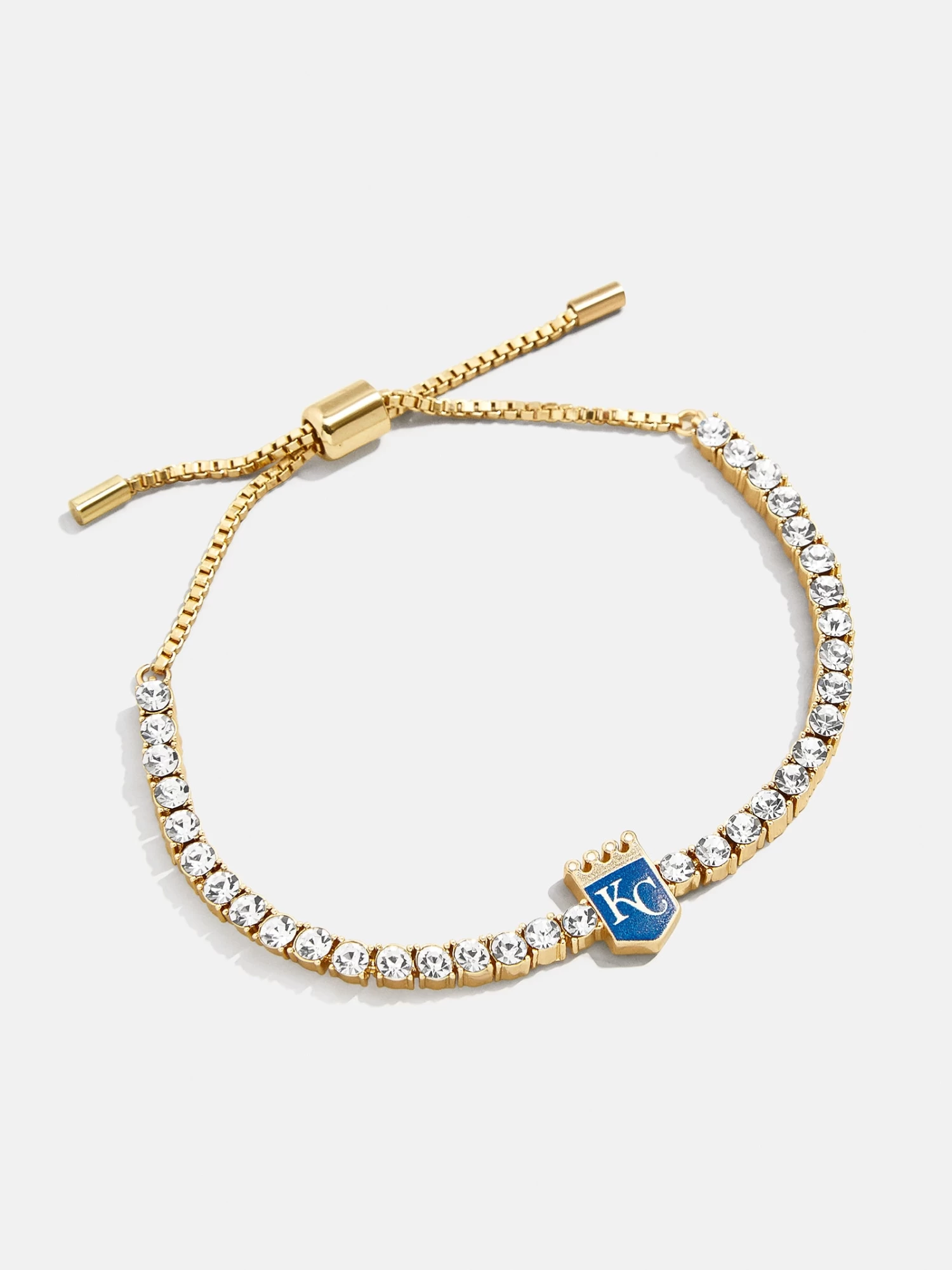 The Kansas City Royals MLB Gold Tennis Bracelet features the Royals’ logo flanked by an eternity band of crystals and gold hardware. Better yet, this design is complete with a pull-tie closure, ensuring the perfect wrist fit for game day (and every day).