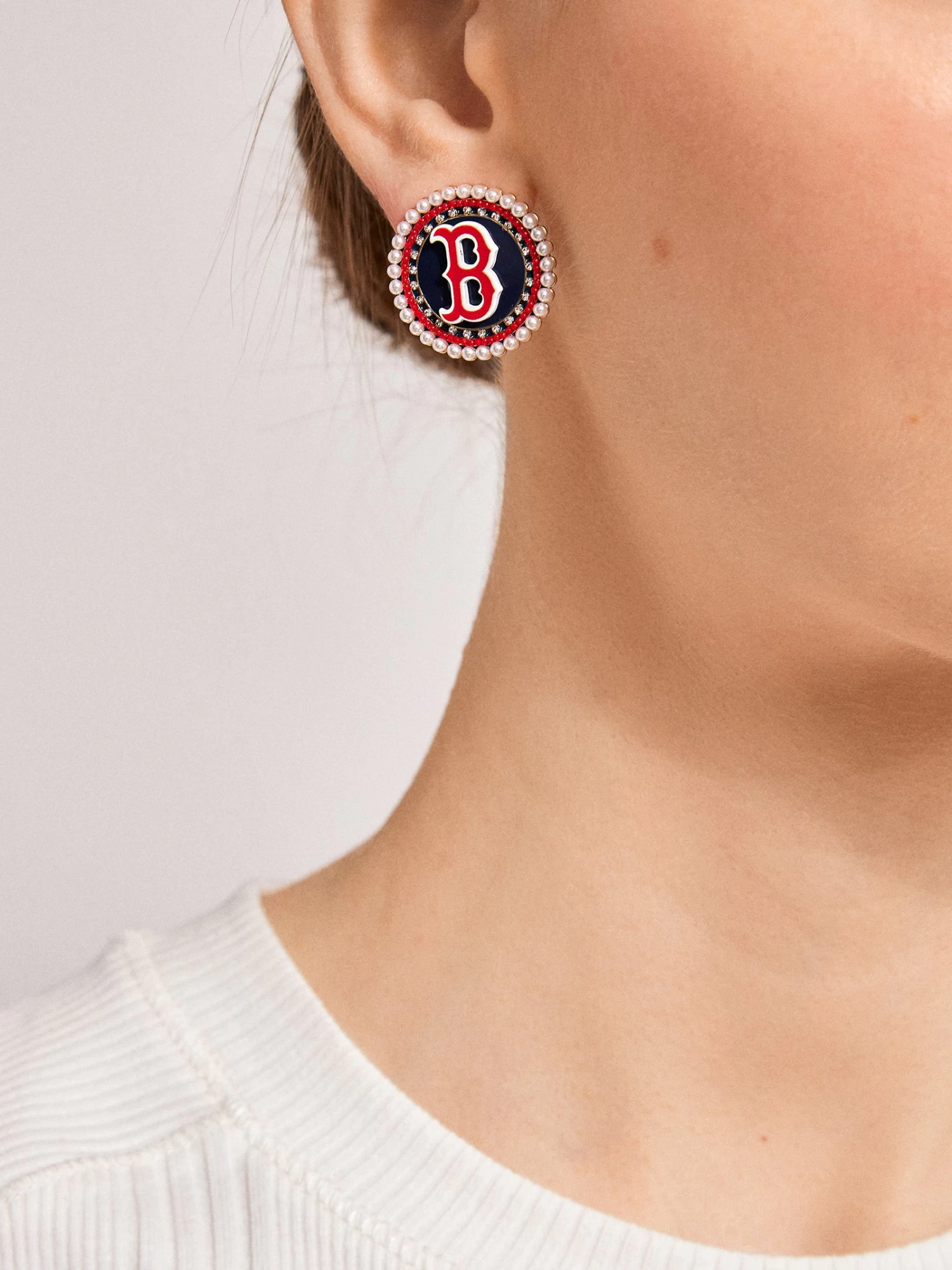 Wear your team loud and proud on your lobes. These Boston Red Sox Statement Studs feature the team’s red logo on a black enamel background and and is complete with a pearl border.