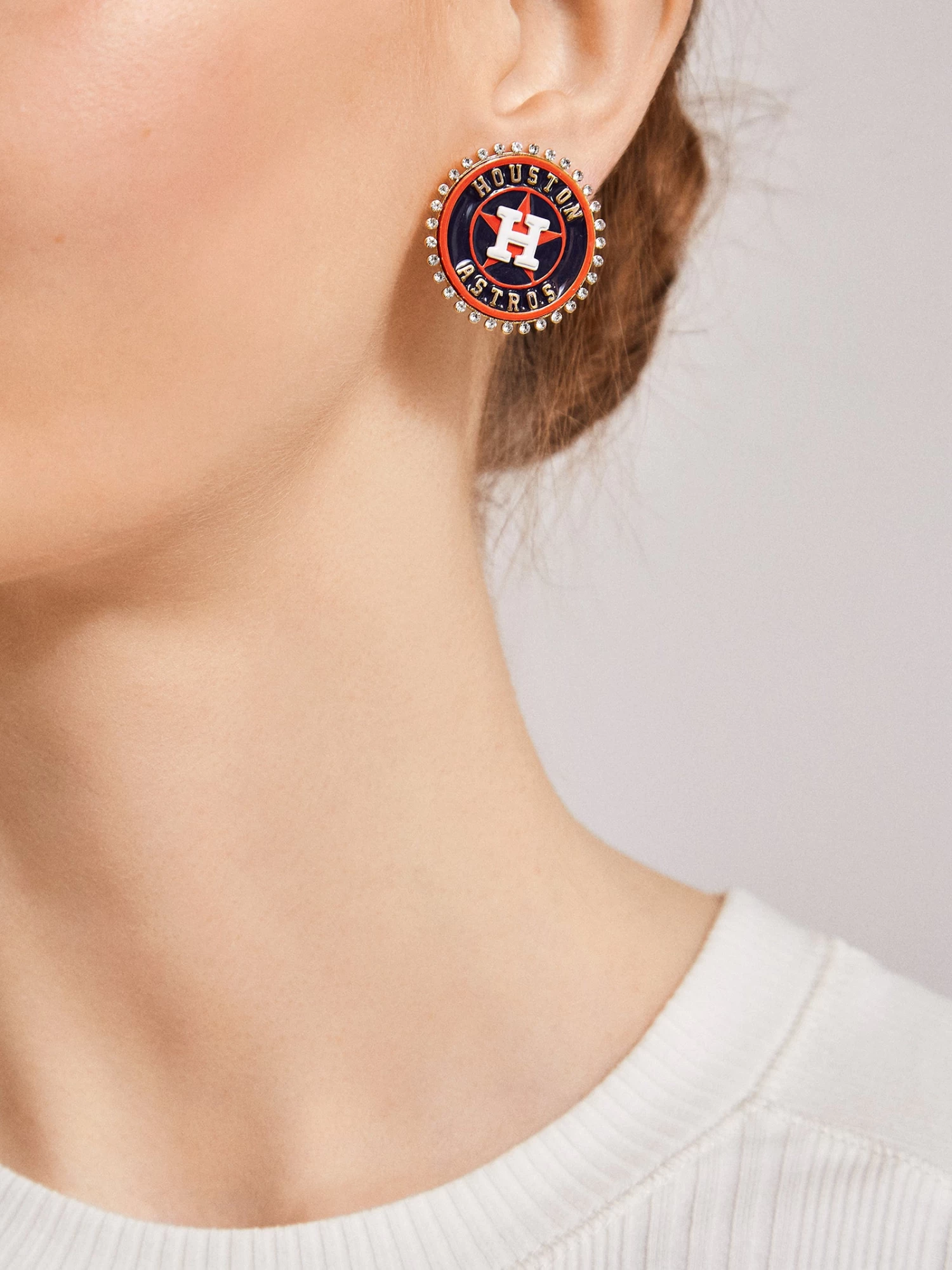 Wear your team loud and proud on your lobes. These Houston Astros Statement Studs feature the team’s logo on a bright enamel background with a sparkly stone border.