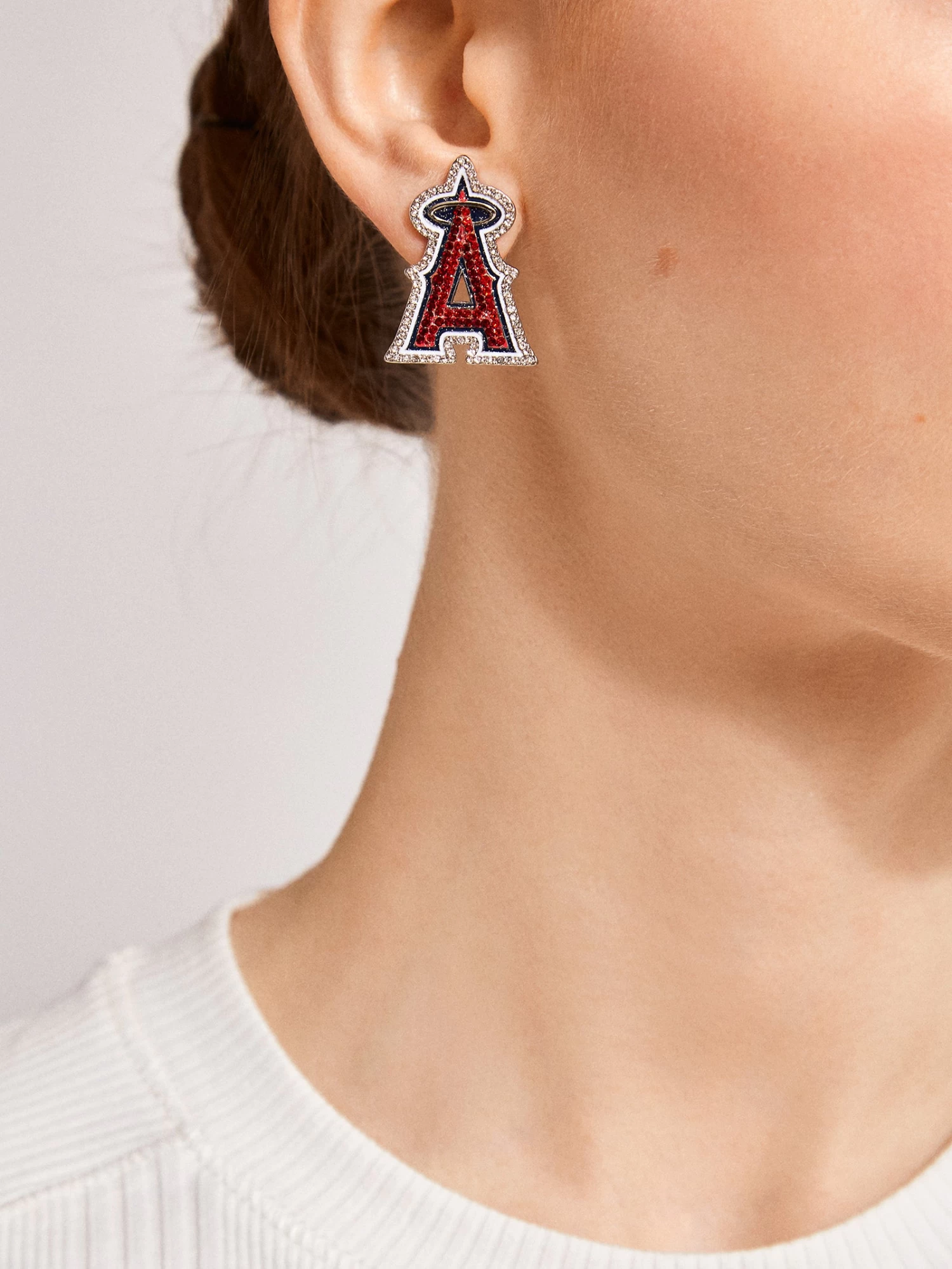 Wear your team loud and proud on your lobes. These Los Angeles Angels Statement Studs feature the team’s logo complete with a bevy of clear and red gems.