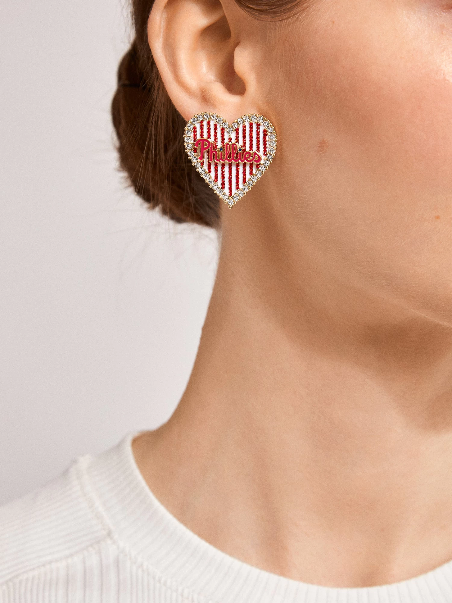 Wear your team loud and proud on your lobes. These Philadelphia Phillies Statement Studs feature the team’s logo on a sparkly & striped heart-shaped background.