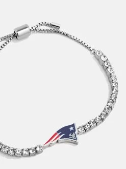 Our NFL tennis bracelets bring fashion to football. The New England Patriots Silver Tennis Bracelet features the Patriots’ logo flanked by an eternity band of crystals and silver hardware. Better yet, this design is complete with a pull-tie closure, ensuring the perfect wrist fit for game day (and every day).