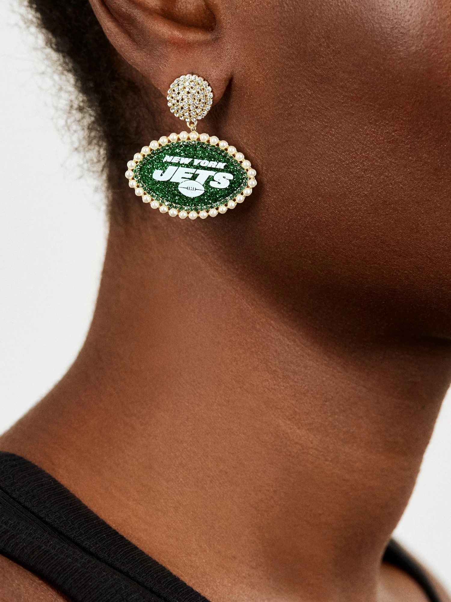 Wear your team loud and proud on your lobes. These New York Jets statement stud drops feature a pavé stud connected to a New York Jets logo on green. Pearl surrounds the drop for a little extra detail.