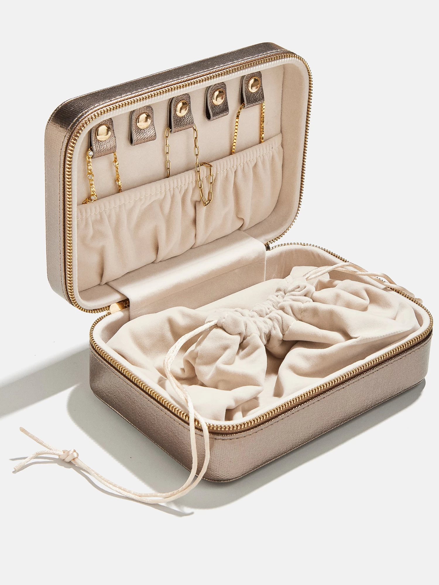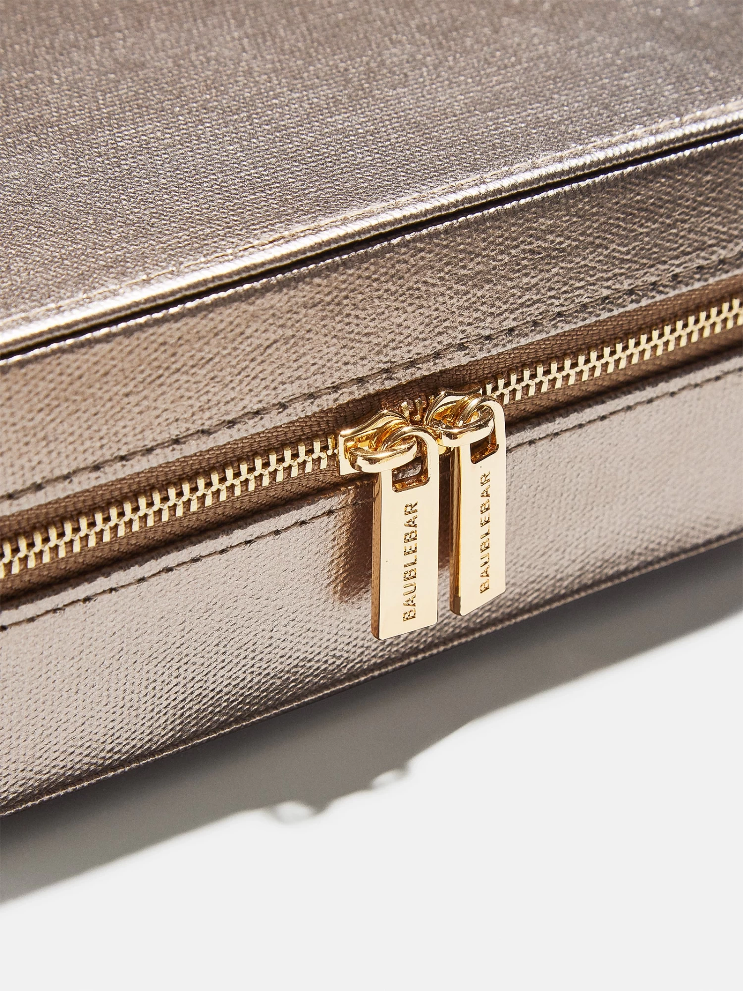 Tote your trinkets everywhere in our Rectangle Jewelry Storage Case. This faux leather jewelry case features compartments for all of your favorite accessories – bracelets, rings, necklaces, and earrings – and fits perfectly into any bag or suitcase. This case features three removable compartments so you can stay organized at all times. Complete with a luxe gold BaubleBar zipper, this is the perfect piece to hold your jewelry.