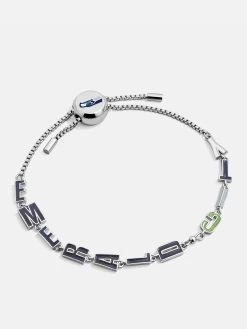 Our NFL Slogan Bracelets are fan gear like you’ve never seen before. The Seattle Seahawks Silver Slogan Bracelet features the phrase “Emerald City” in blue, silver, and green enamel letter beads. This silver bracelet is topped off with the Seahawks’ logo on the pull-tie closure.