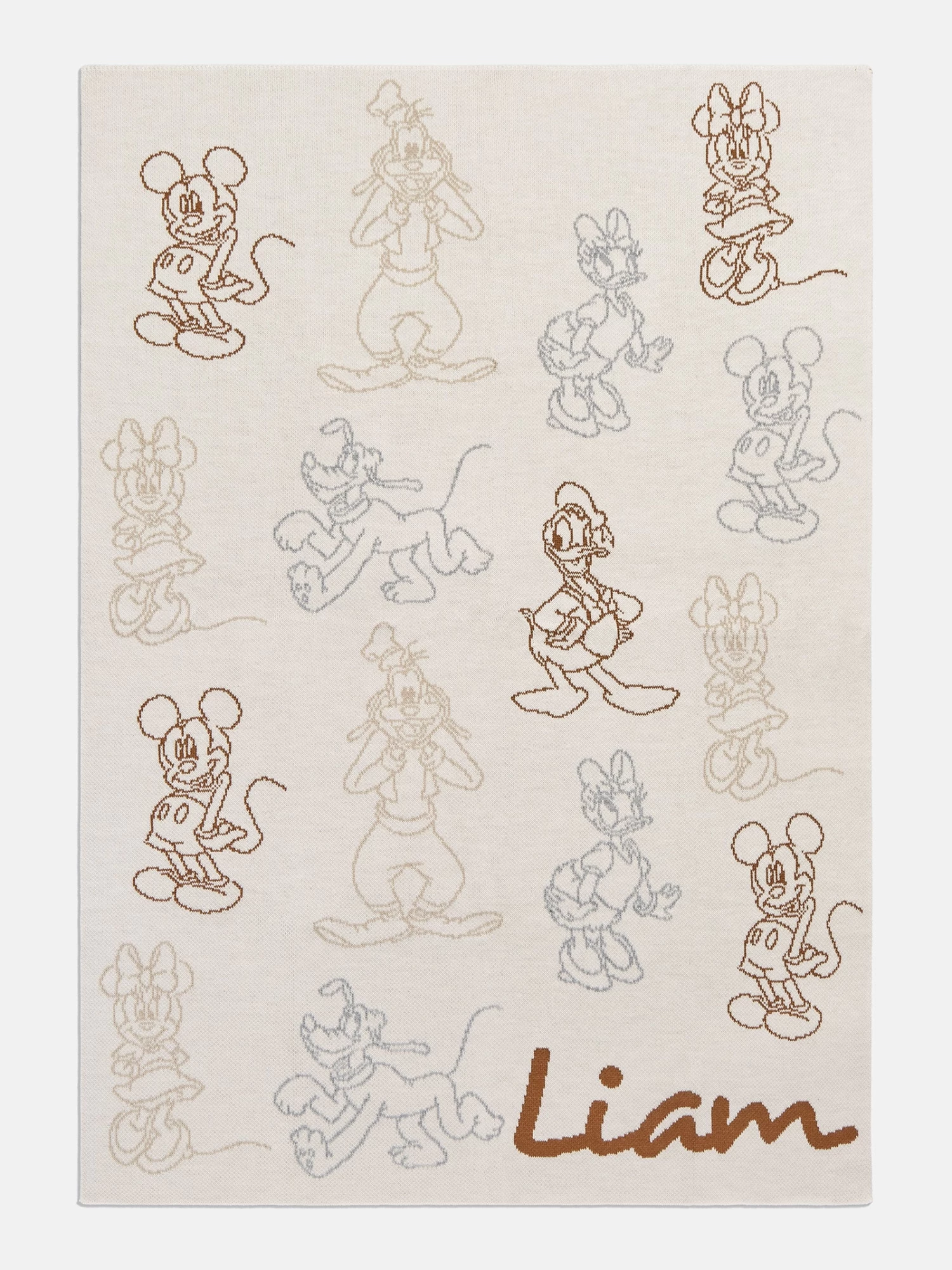 Stay cozy with your favorite characters with our Sensational Six Disney Custom Blanket: Neutral / Beige. This blanket features Mickey Mouse, Minnie Mouse, Donald Duck, Daisy Duck, Goofy, and Pluto in chic neutral tones. Add a name, initials, or favorite phrase of your choosing. Please check the product details for measurements.